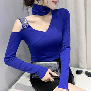 Autumn Winter Turtleneck Women Tops Fashion Long Sleeve Patchwork Mesh T-Shirt Plus Size Diamond Blusas Shirt  - Regular price
