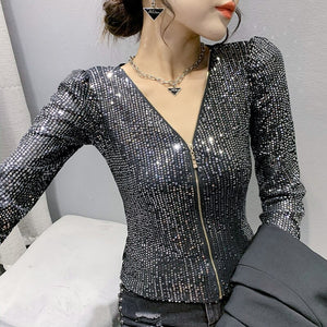 2022 New Spring Women's T-Shirt Fashion Casual Sequined V-neck Long-Sleeved Mesh Tops Elegant Slim Plus Size Women Clothing