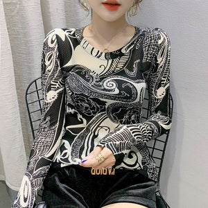 New 2021 Autumn Women's Clothing Fashion Casual Long Sleeve Print Elastic Mesh T-Shirt M-3XL Plus Size Blusas Tops