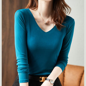New Arrivals 2021 Autumn Thin Women's T-Shirt Fashion Casual V-Neck Long-Sleeved Mesh Tops Shirt Plus Size Solid Color Blusas