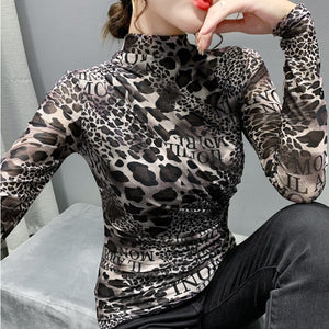 New Autumn Winter Women's T-Shirt Fashion Long Sleeve Turtleneck Leopard Mesh Tops Shirt Plus Size Women Clothing