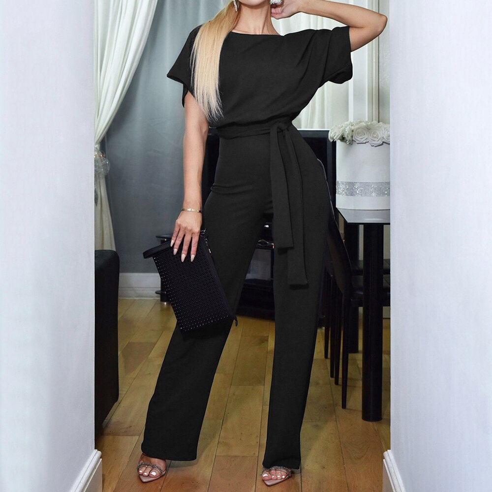Elegant Short Sleeve Lace Up Jumpsuit Women Summer 2021 Fashion Casual O-neck Solid Slim Clothes Pink Rompers Womens Jumpsuit