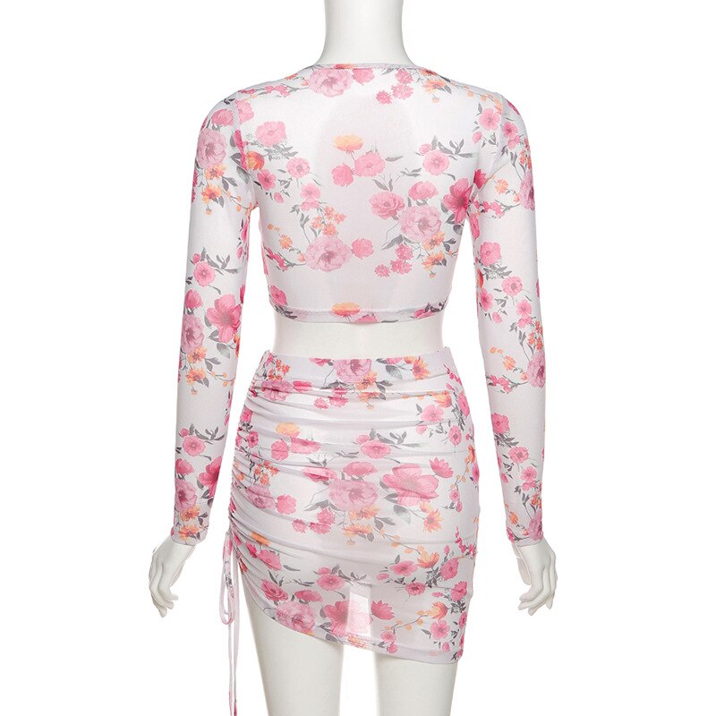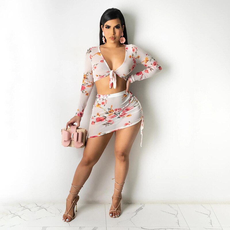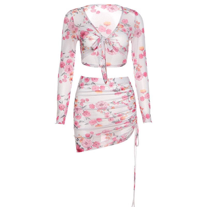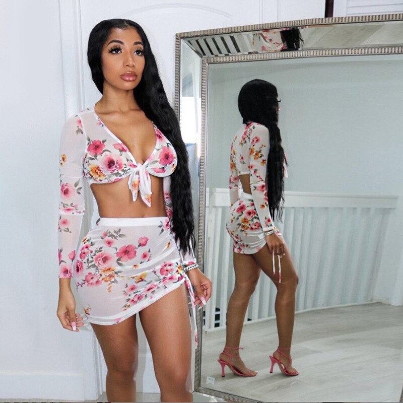 2021 Sexy Flower Printed Two Piece Dress Set Women Long Sleeve Crop Top Lace Up Mini Skirt Autumn Beach Boho Female Dress Sets