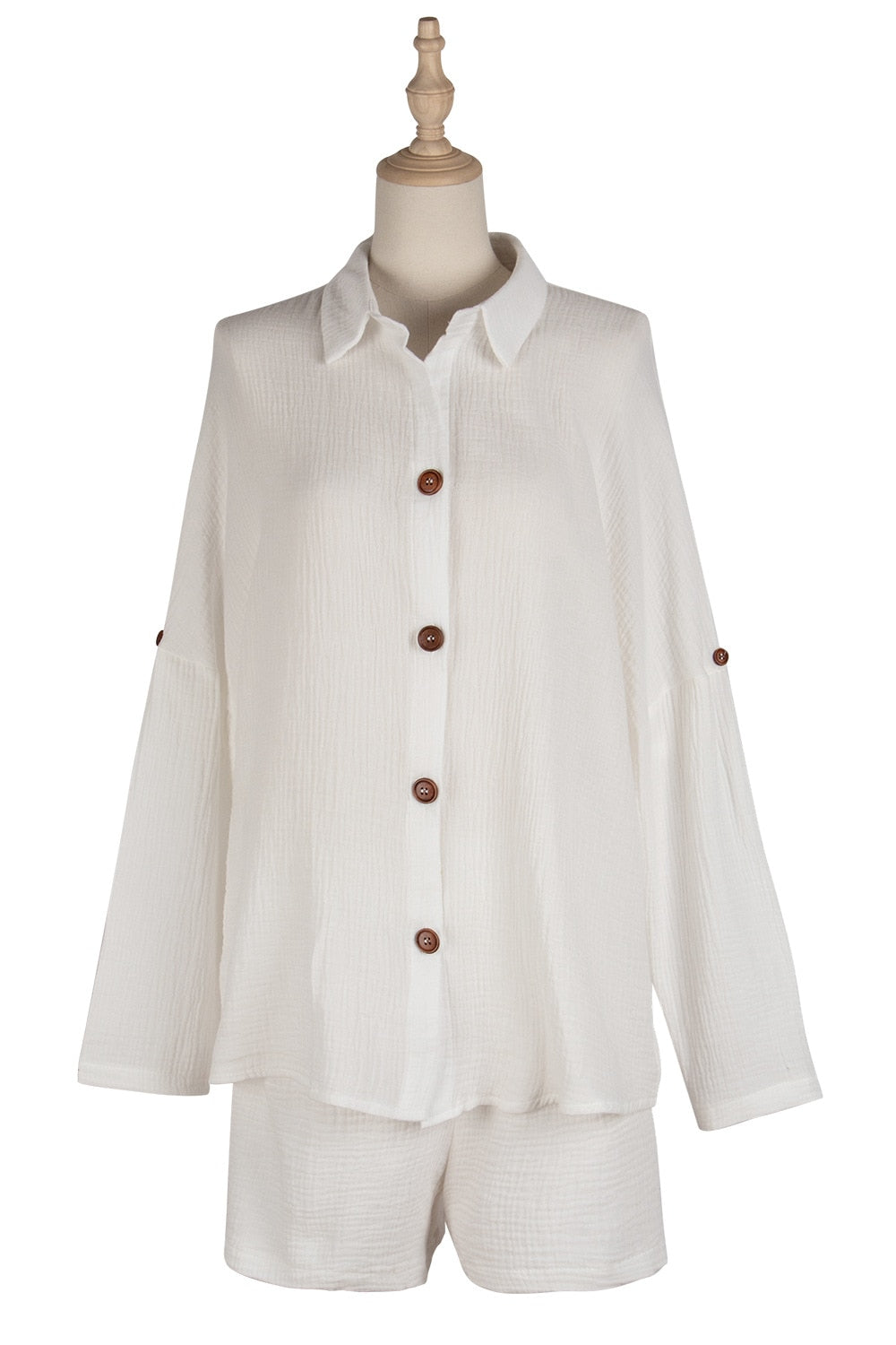 2021 Summer Beach Casual Button White Women's Sets Cotton Linen Two Pieces Sets Long Sleeve Shirt and Shorts Women Set Outfits