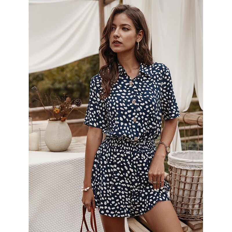 2021 Summer New Women's Fashion Casual Floral Print Turn Down Collar Buttons Folds Tunic Empire Slim Straight Playsuits Ladies