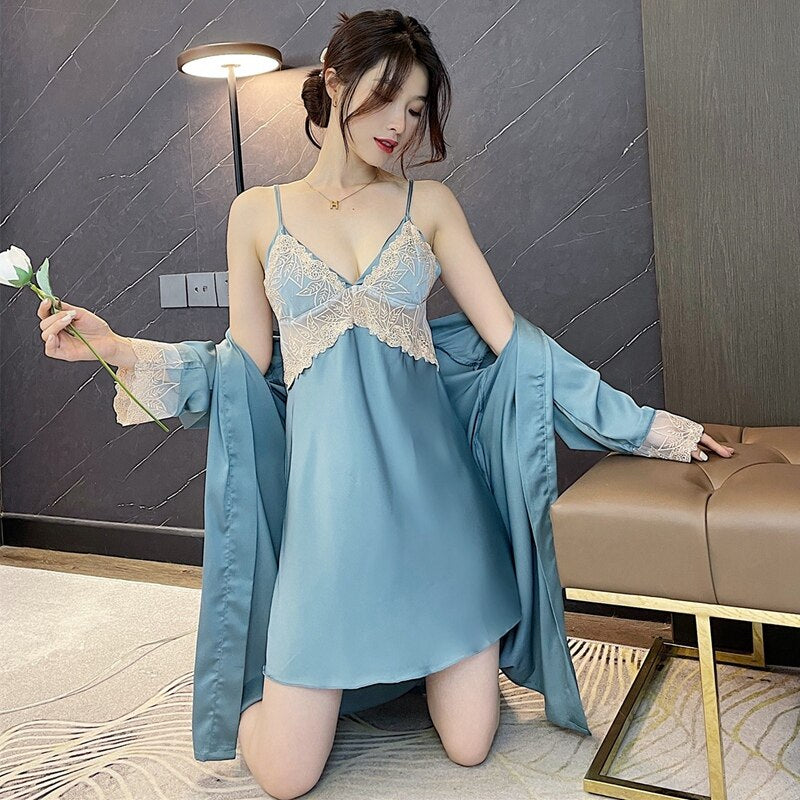2022 Spring Summer Silk Satin Sexy Lace Lingerie Nightgowns Robes Sets For Women Bathrobe Sleepwear Suit Nightdress Night Dress