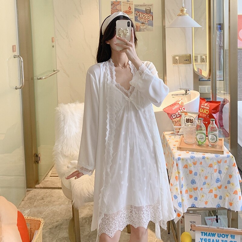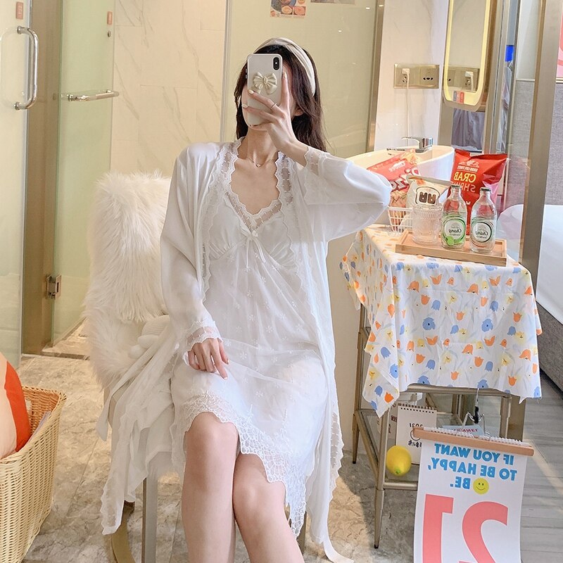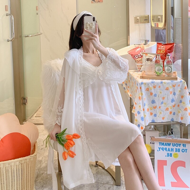 2PCS Sexy Lace Lingerie Nightgowns Robe Sets for Women Korean Summer Silk Satin Bathrobe Sleepwear Nightdress Night Dress Nighty