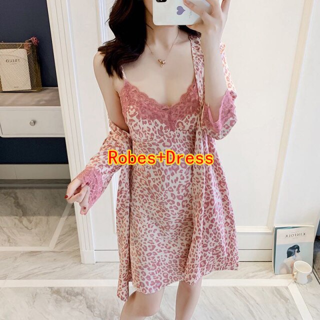 2PCS Silk Satin Sexy Leopard Lace Lingerie Nightgowns Robe Sets Women 2021 Summer Bathrobe Sleepwear Suit Nightdress Night Dress