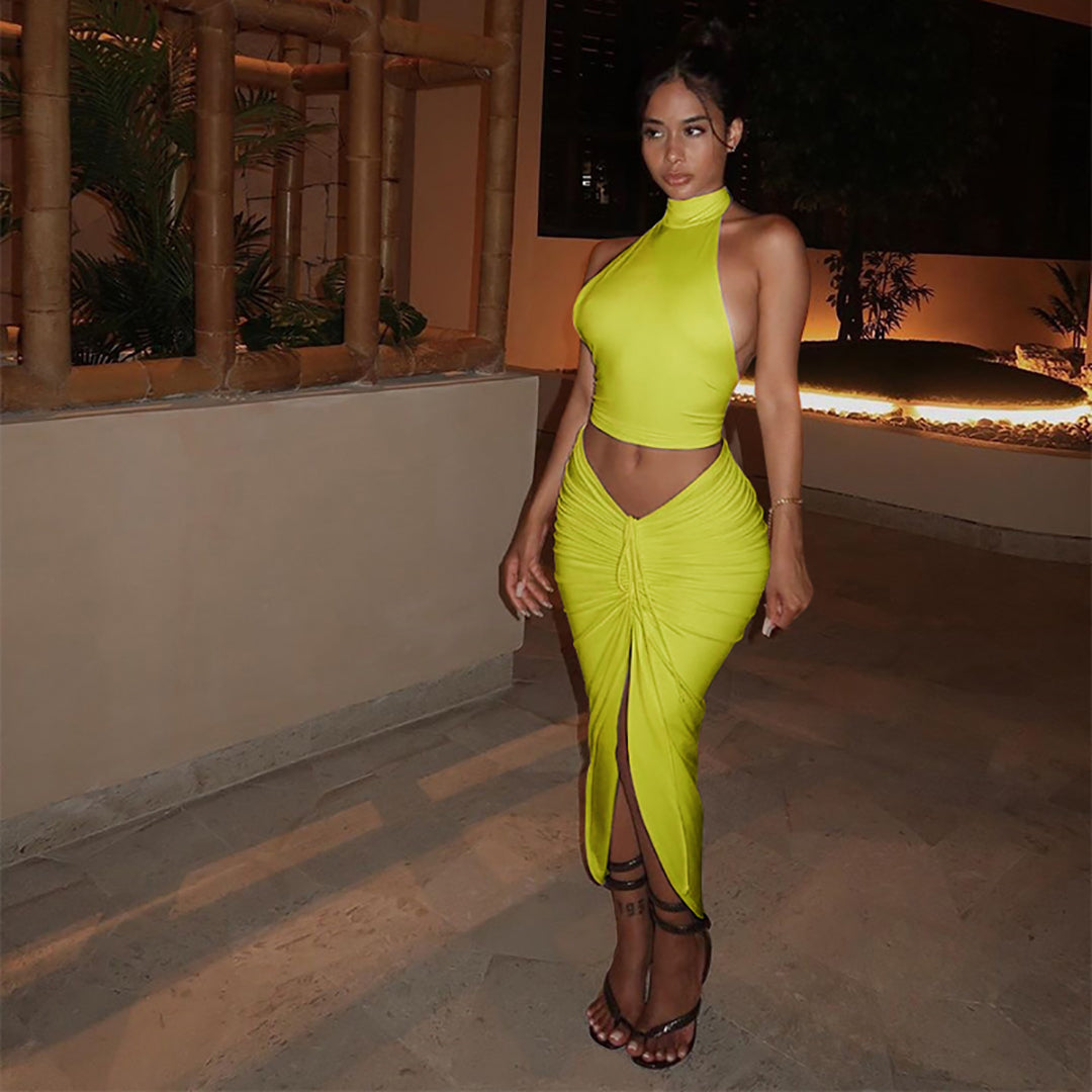 Casual Women 2 Piece Sets O Neck Off Shoulder Sleeveless Tanks Top and Front High Split Drawstring Lace Up Skirts Party