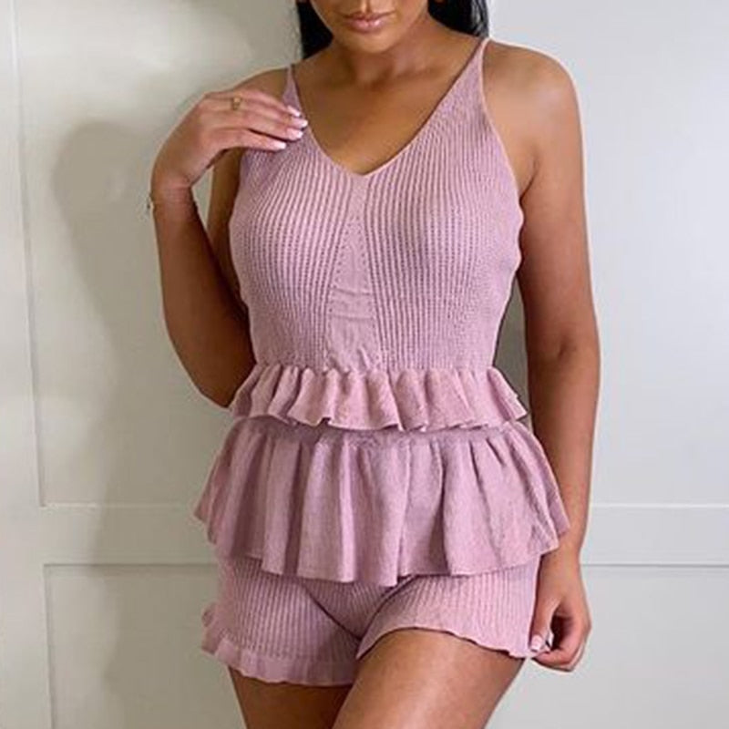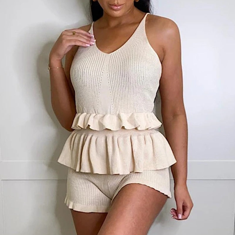 Fashion Knitted Solid Suits Women Elegant Ruffles V Neck Sleeveless Tops Suit Women Casual Shorts Suits Ladies