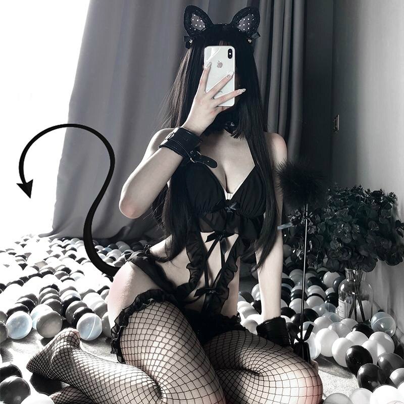 Japanese Lingerie Summer Pajamas Women Casual Sleepwear Nightwear Pajama Sets Black Cat Top and Lace Trim Striped Shorts
