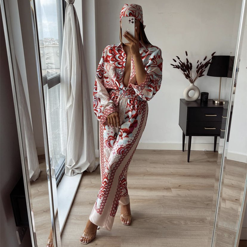 PUWD Elegant Woman Red Print Shirt Suits 2021 Spring Fashion Ladies Indie Folk Suits Ladies Vinatge Beach Suits