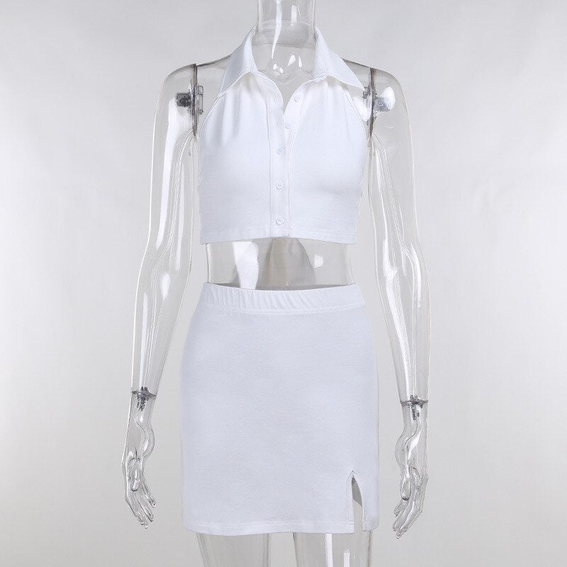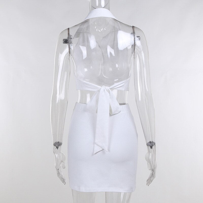 Sexy Polo-Neck Crop Tops Mini Skirts Set Women Backless High Waist Elastic Skirt Suits 2021 Summer Sports Casual Two Piece Sets