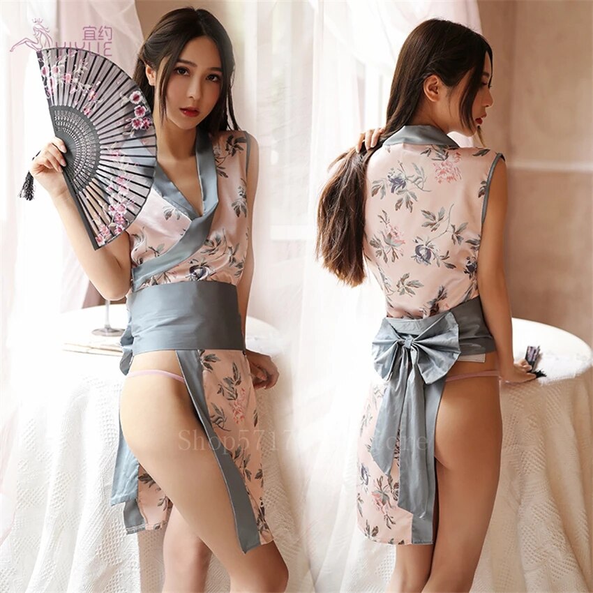 Sleepwear Women Japanese Clothes Sexy Erotic Sets Split Dress Role Playing Print Cardigan Kimono Sleeveless Adult Girl Nightgown