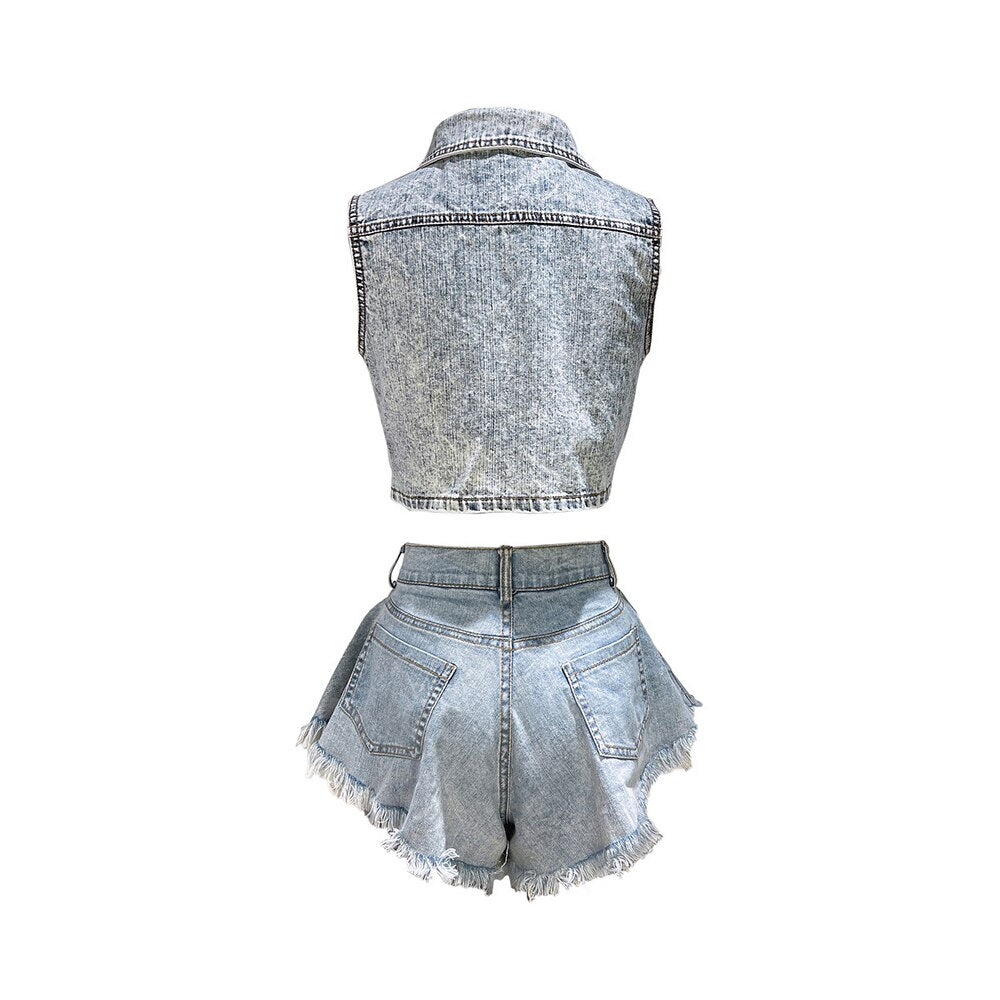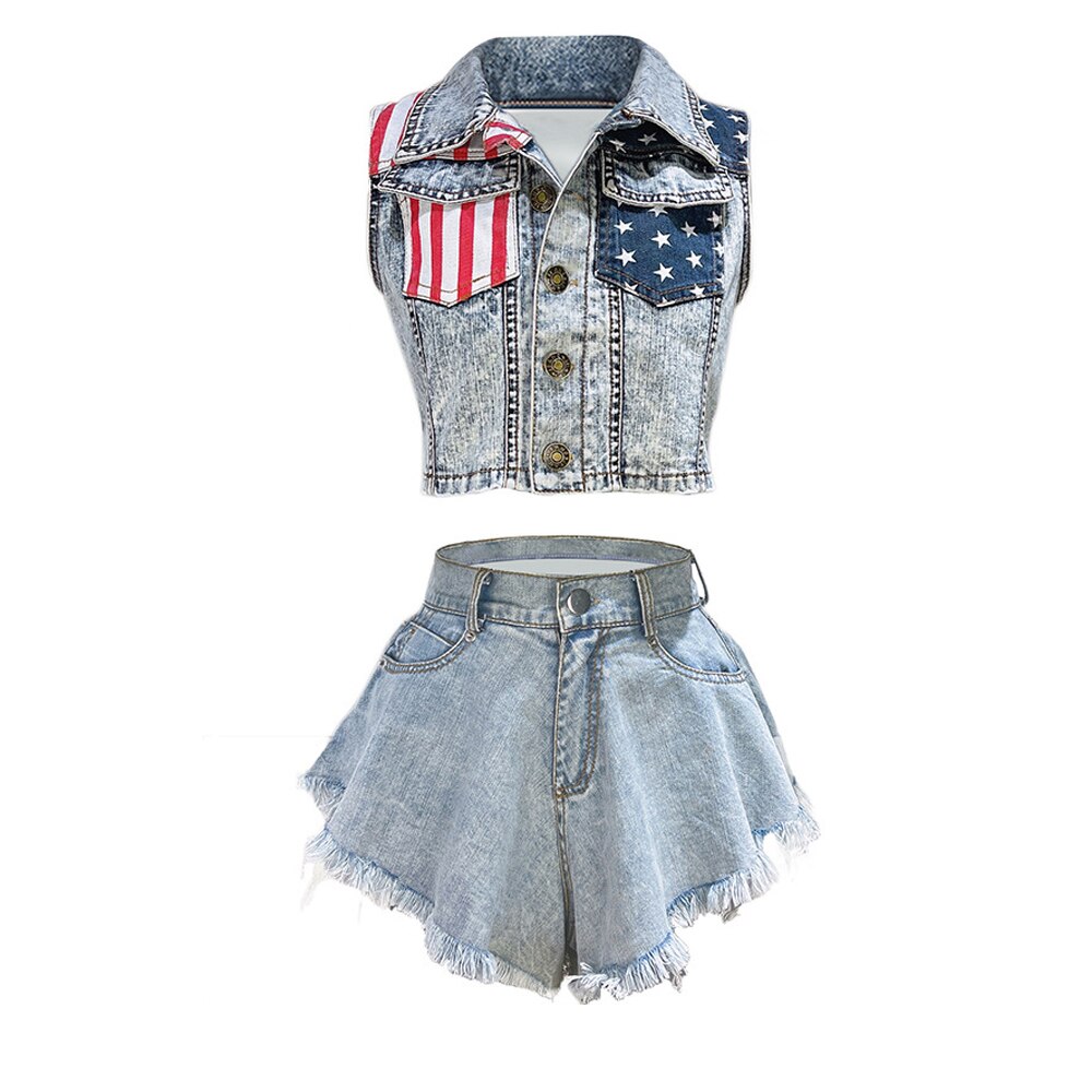 Summer Fashion American Flag Denim Waistcoat Tassel Shorts Two Pieces Set Slim Vest Tops Suits Set For Women