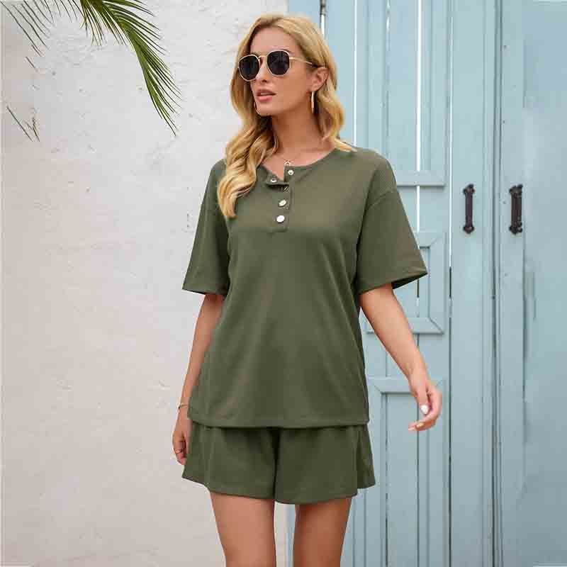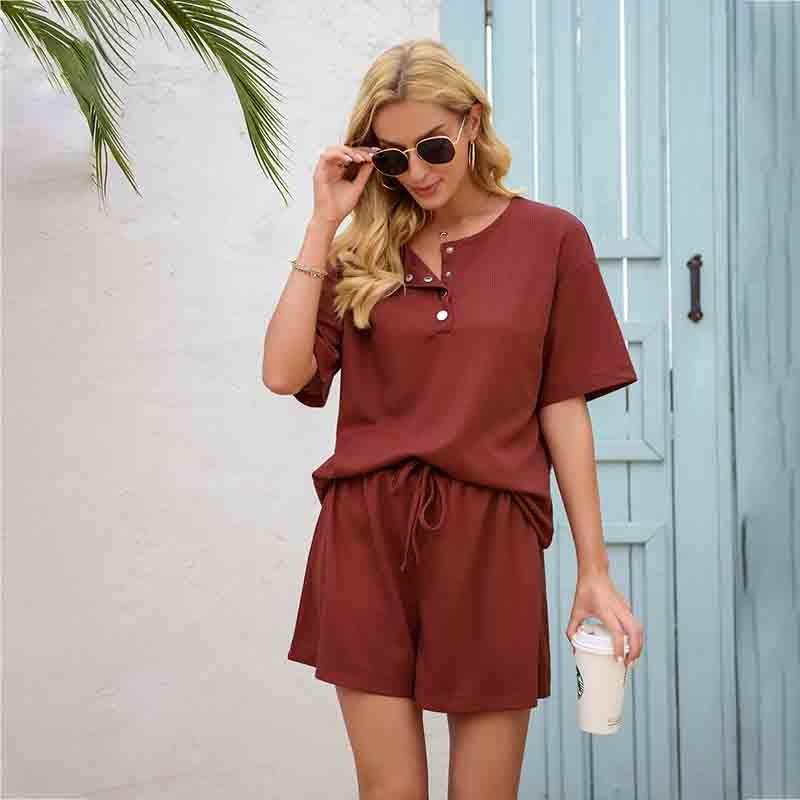 ♥Design: Ladies two-piece suit. Casual pullover top, round neck, short sleeves, loose style, solid color, short style. The soft shorts match the highly elastic waist and adjustable straps.