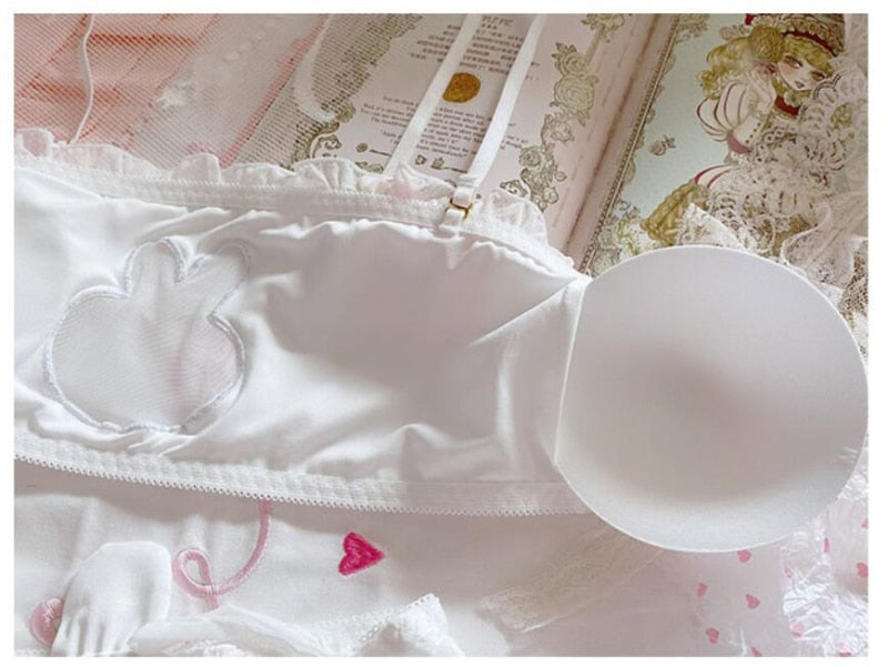Sweet Cute Lolita Sexy Transparent Bra and Panty Sets Underwear Women Rabbit Lingerie Ruffles Intimates Mesh Tube Top Bras White