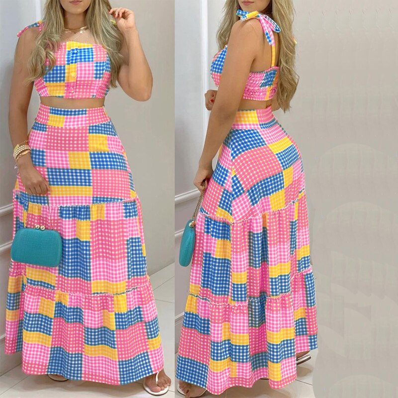 Two Piece Sexy Bandage Tube Top & High Waist Plaid Maxi Skirt Set Women Summer Casual Dress Suits Elegant Hem Skirt 2pcs