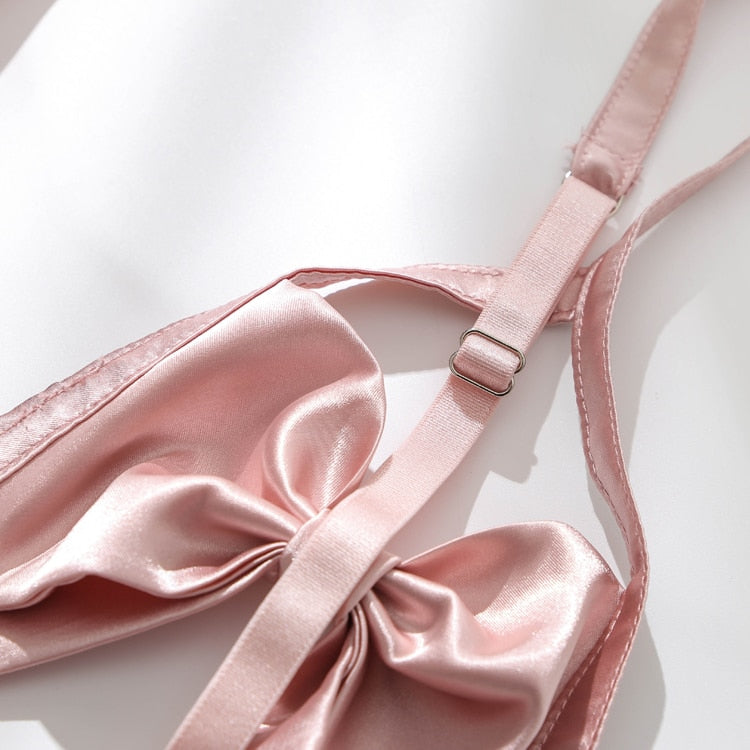 Women Cupless Bra Seducive Sexy Lingerie Sets Sensual Underwear Passion Bow Knot Bra Panty Garter Belt Set Pink Victoria Secret