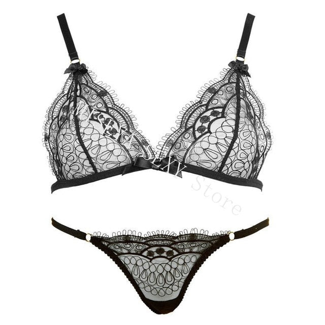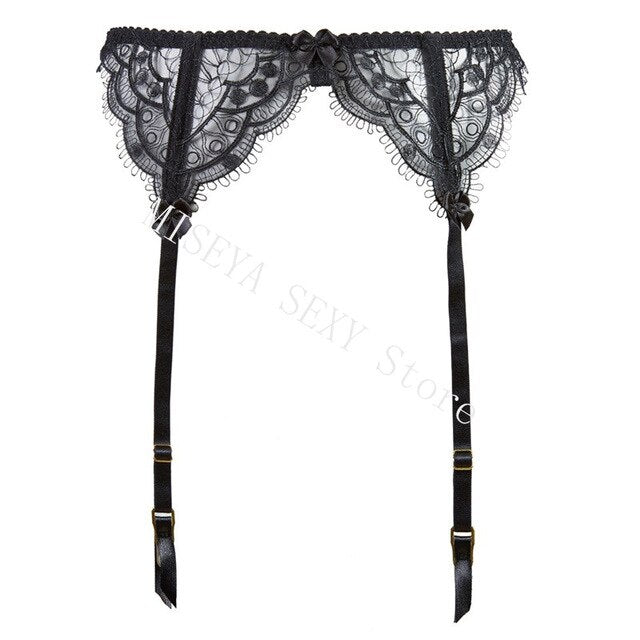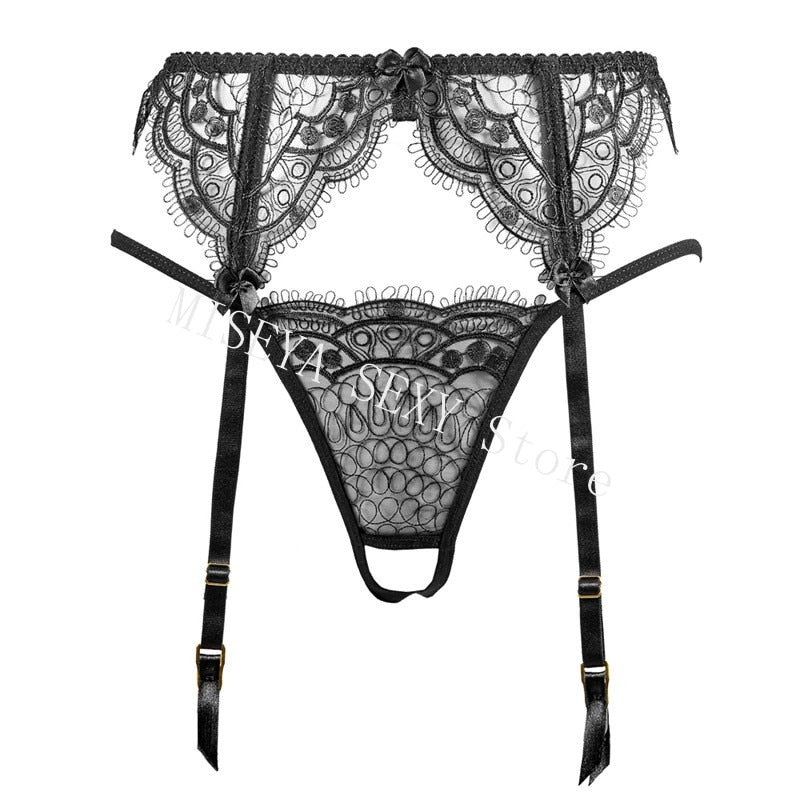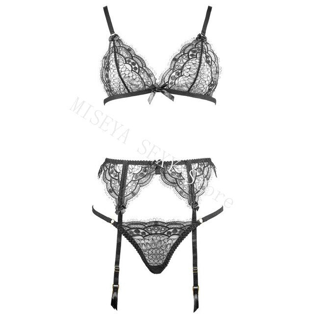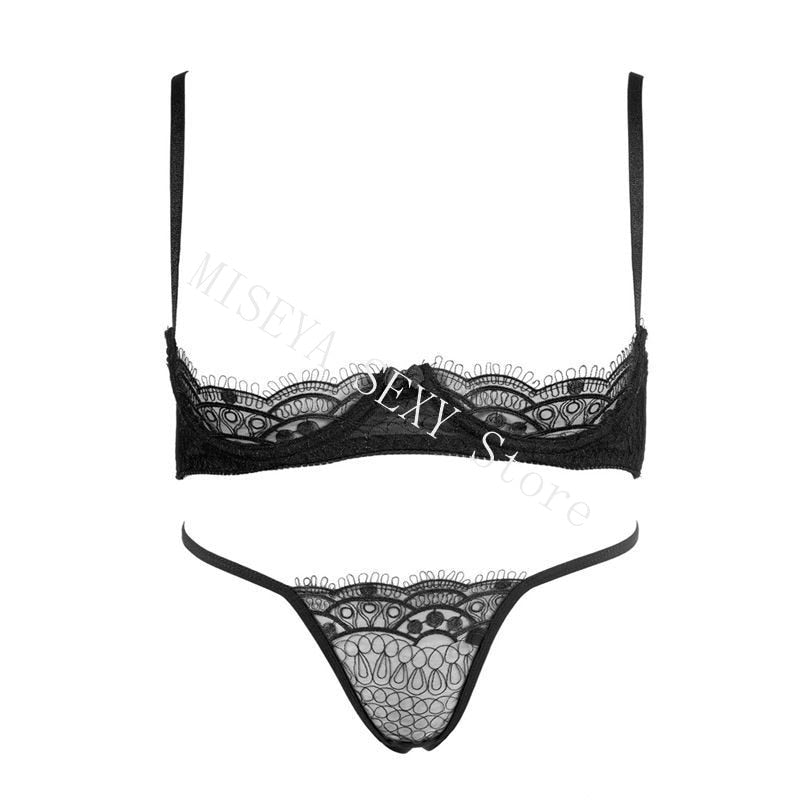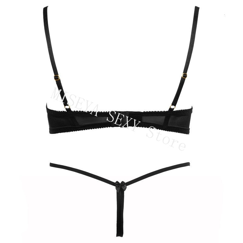 Women Embroidery Lace Ultra Thin Half Cup Bra Open Crotch Panty Sexy Lingerie Set with Garters Black Underwire Bralette Sets