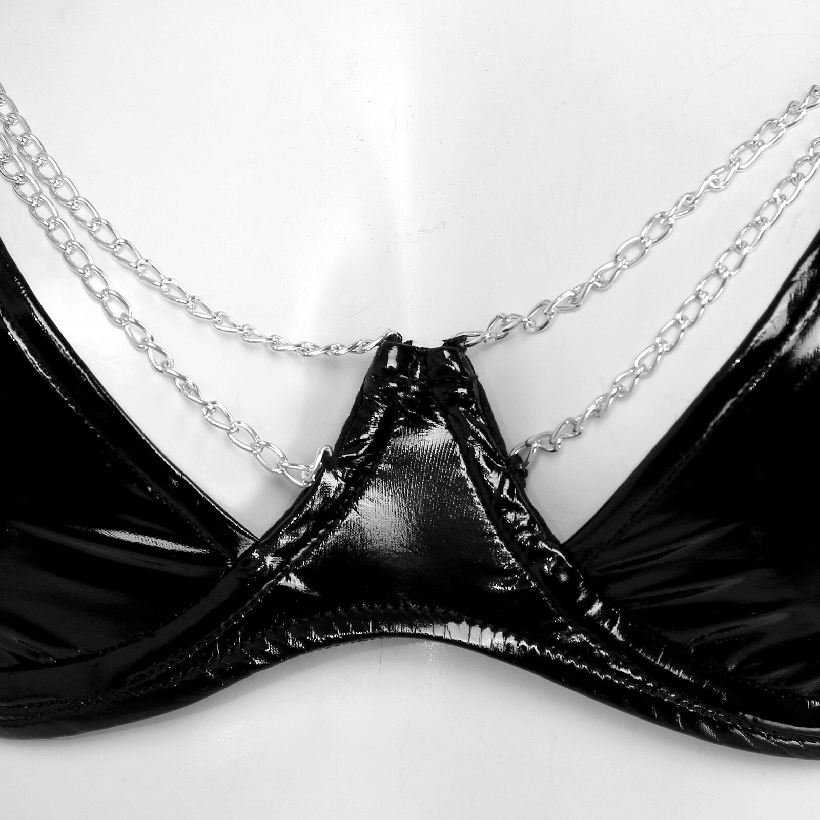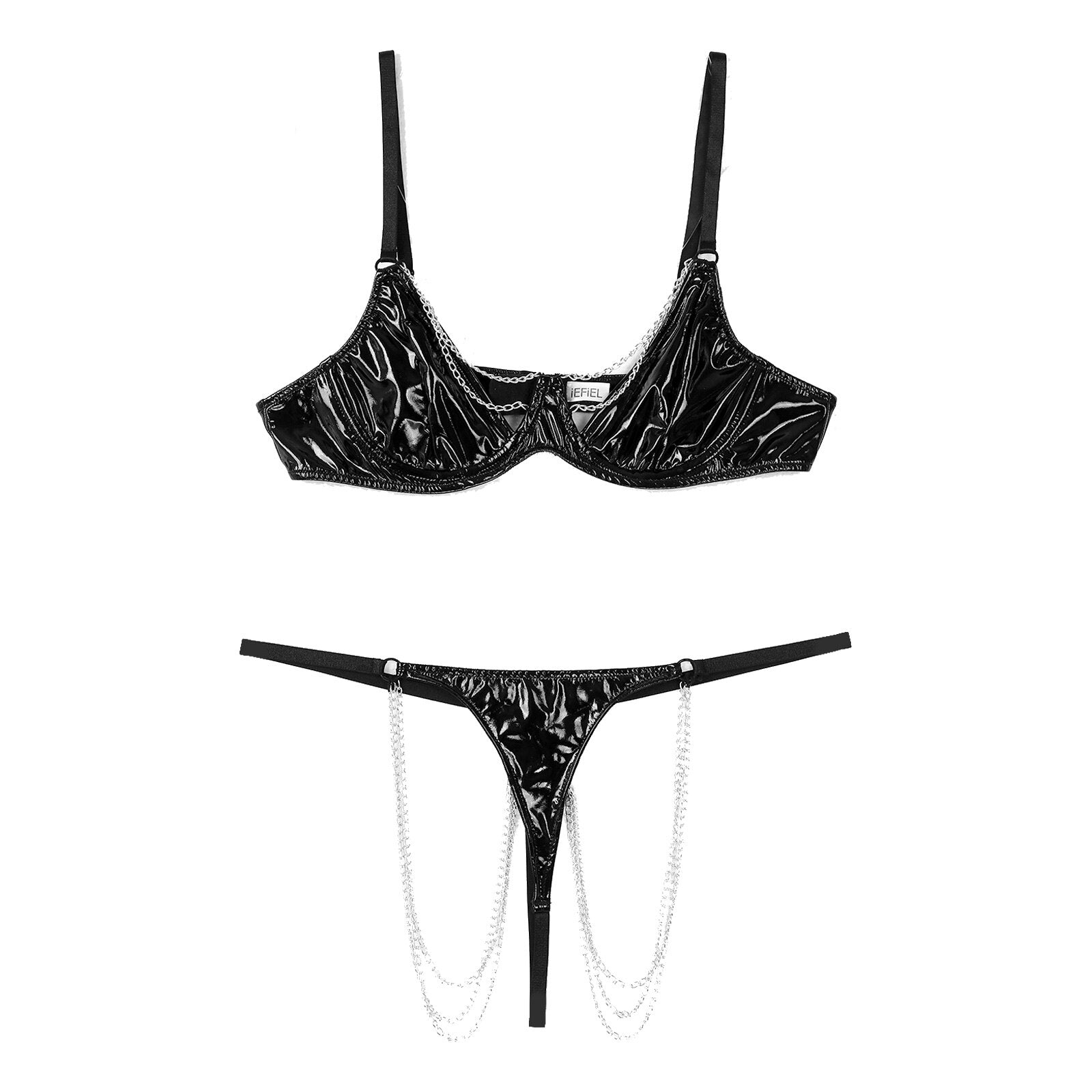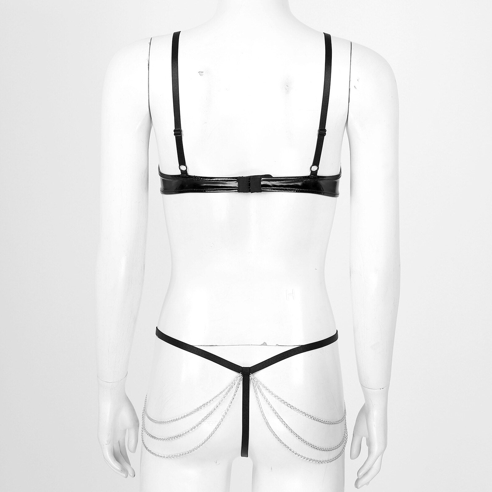 Women Metal Chain Decor Two-piece Outfit Patent Leather Lingerie Set Underwear.