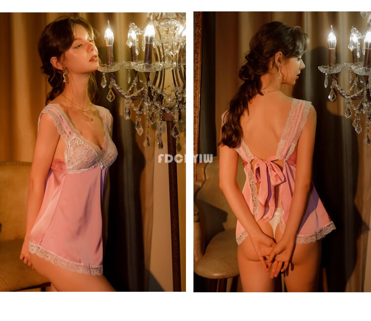 Women Pajama Dress Sleepwear Sets Sexy Lingerie Mini Dress Lace Side Slit Sling Sleep Dress Deep V Ice Silk Nightdress Nightgown