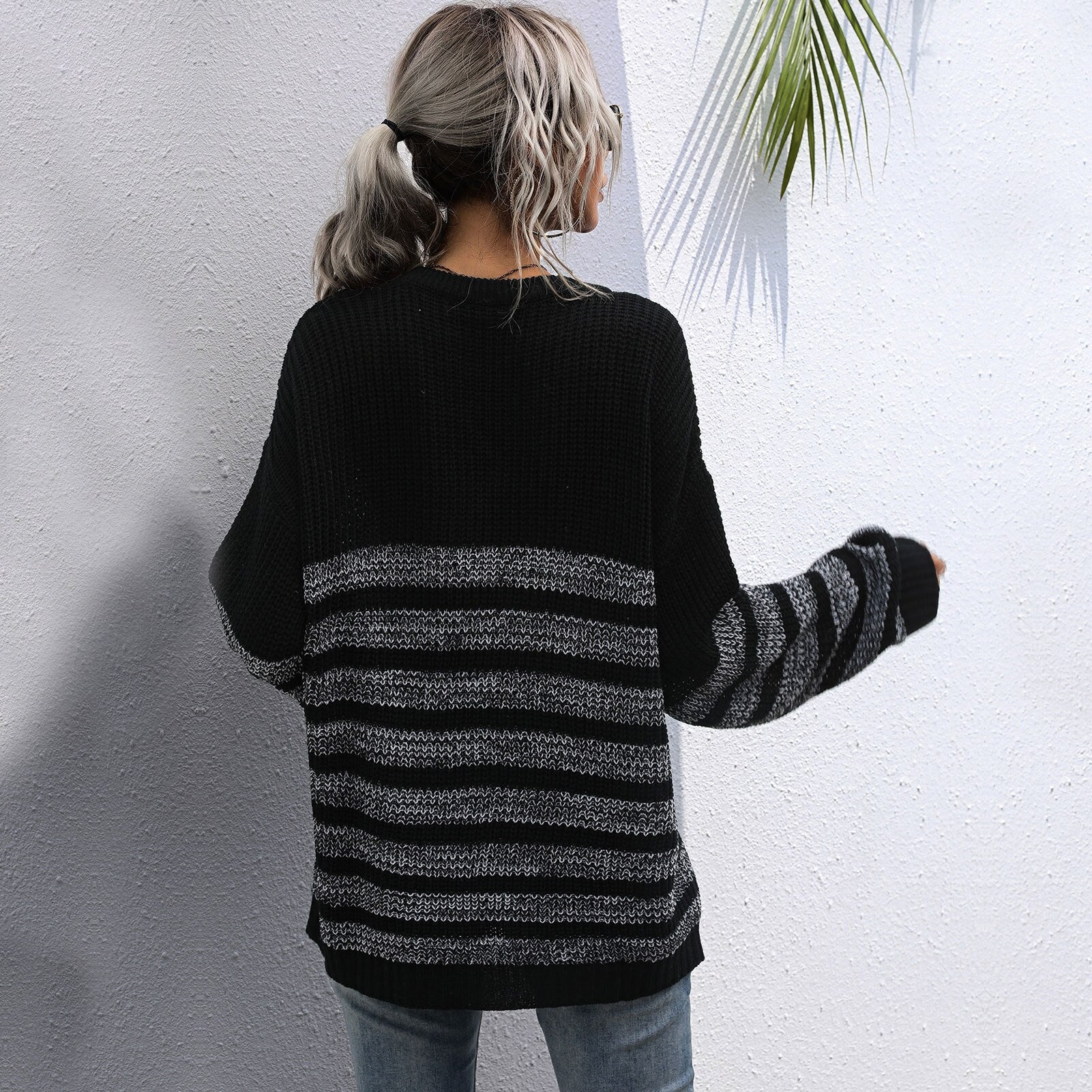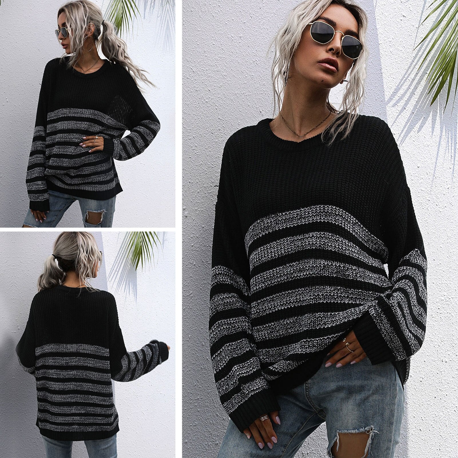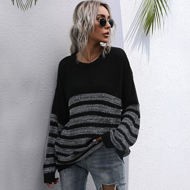 Autumn Lounging Loose Women Knitted Sweater Striped Splicing Pullover Tunics Casual Sweaters Jumper Female Knitted Wear