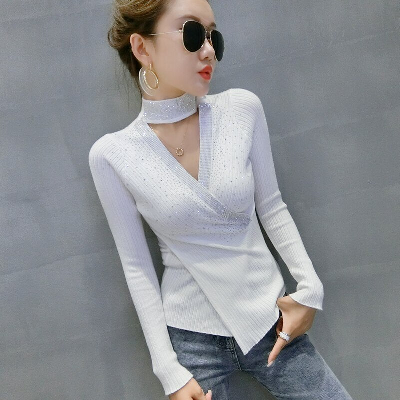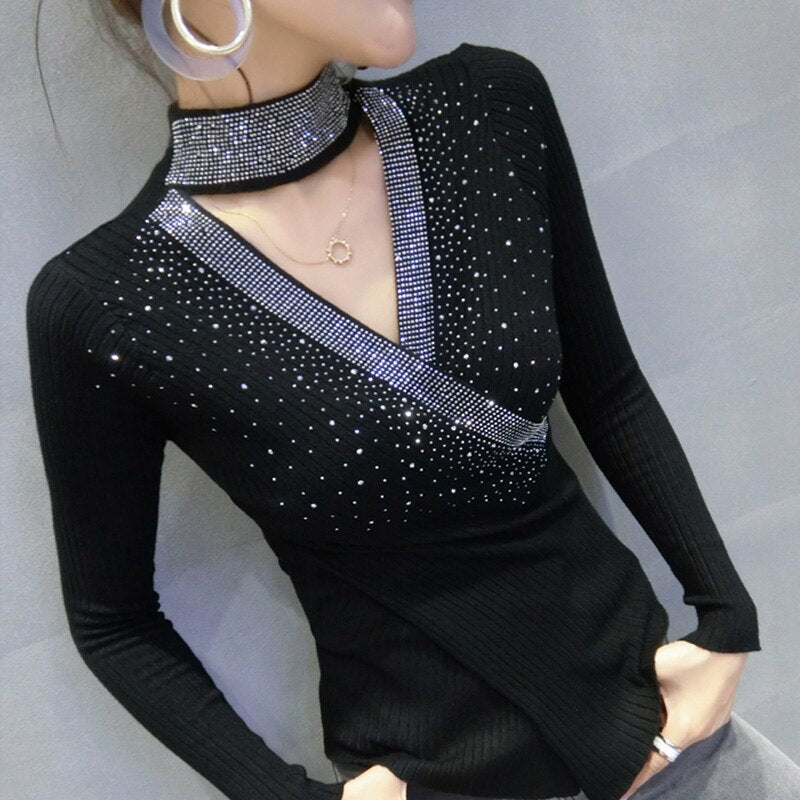 Autumn winter 2021 New women sweaters Fashion sexy v-neck diamond knitted shirt Elegant slim women's pullovers