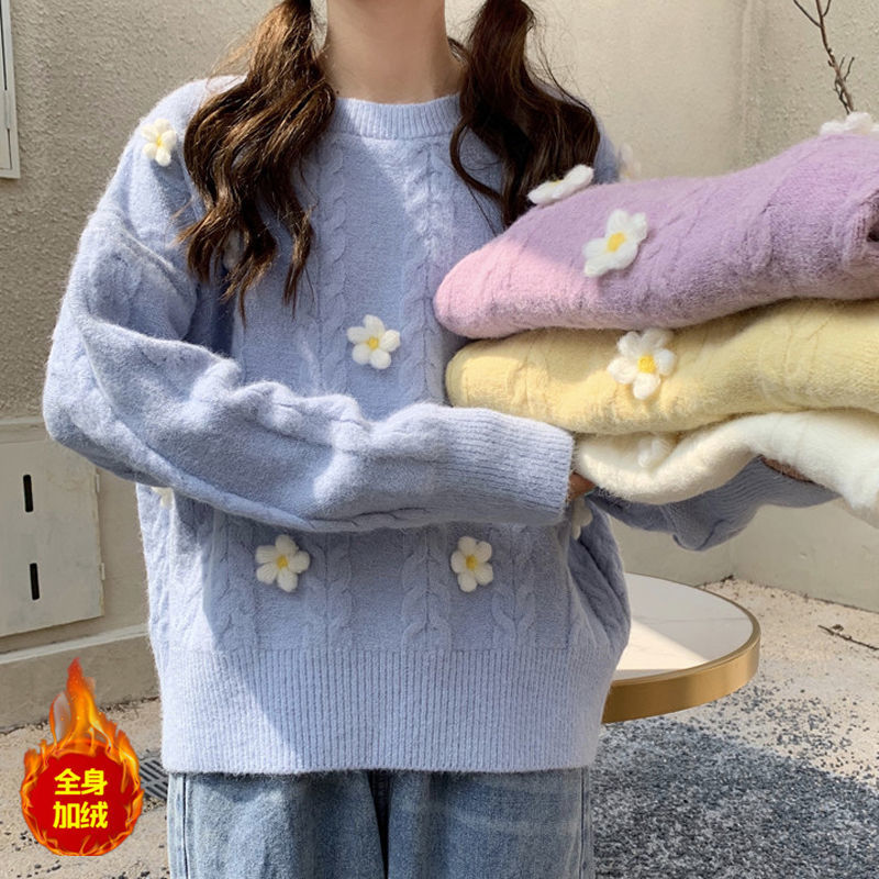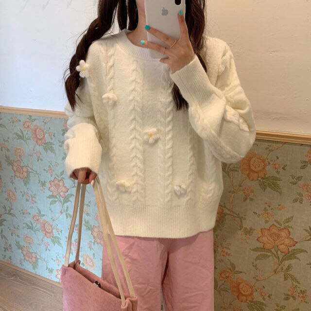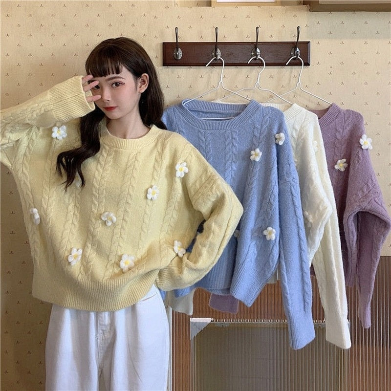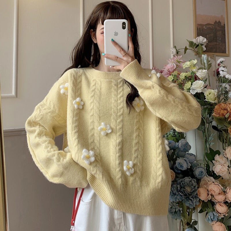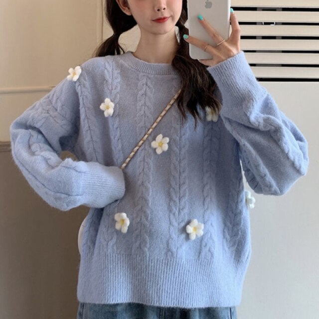Korean Chic Sweet Fresh Three Dimensional Flower Sweaters Women Loose Casual O Neck Long Sleeve Pullovers Autumn Knitted Tops