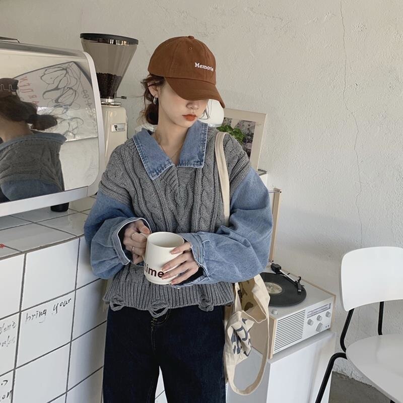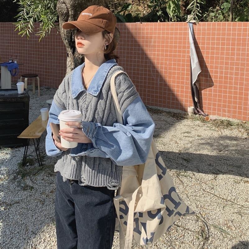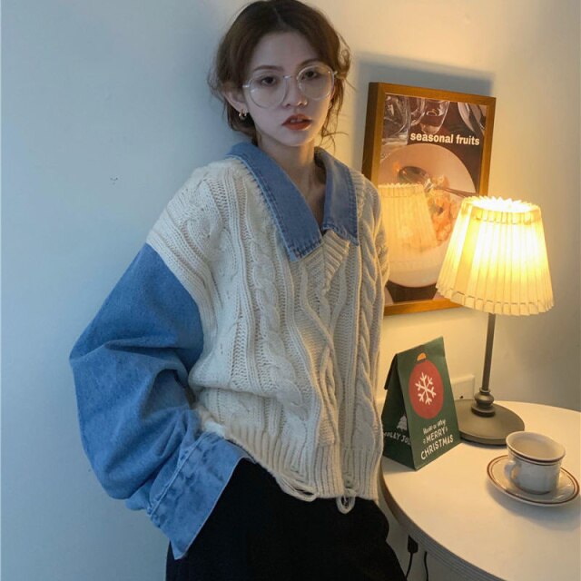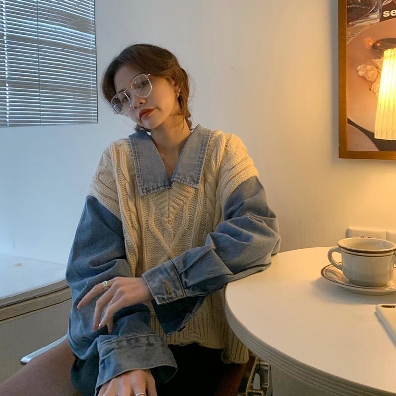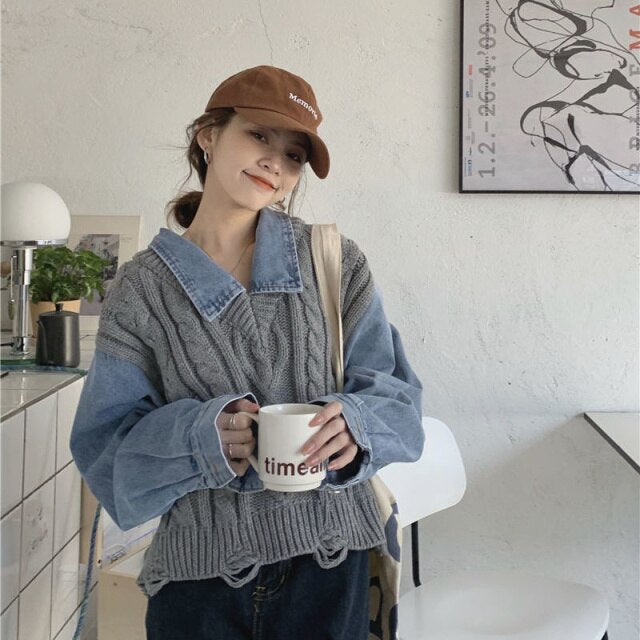 Sweater Women Autumn Fake Two-piece Shirt Cowboy Long Sleeve Stitched Knitted Sweaters Design Sense Top Fashion Pullover Korean
