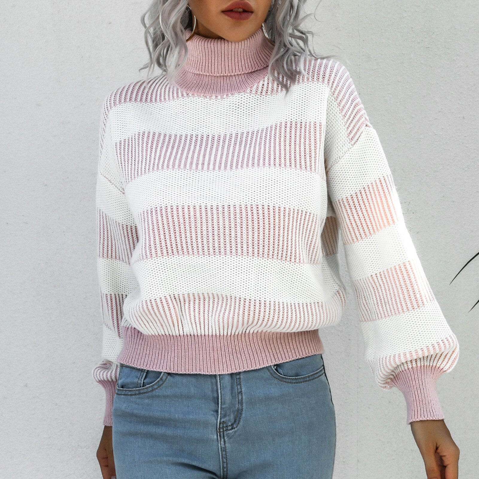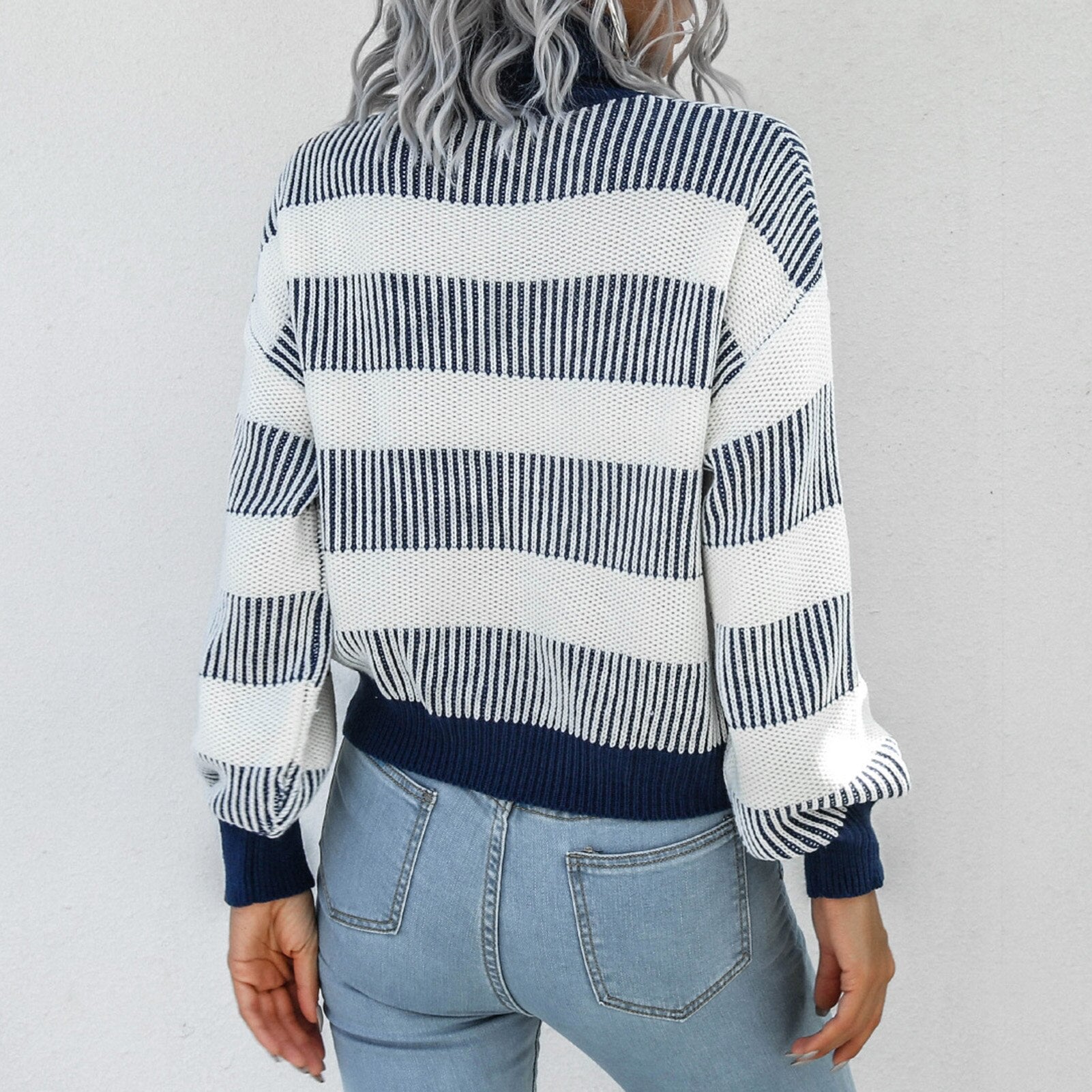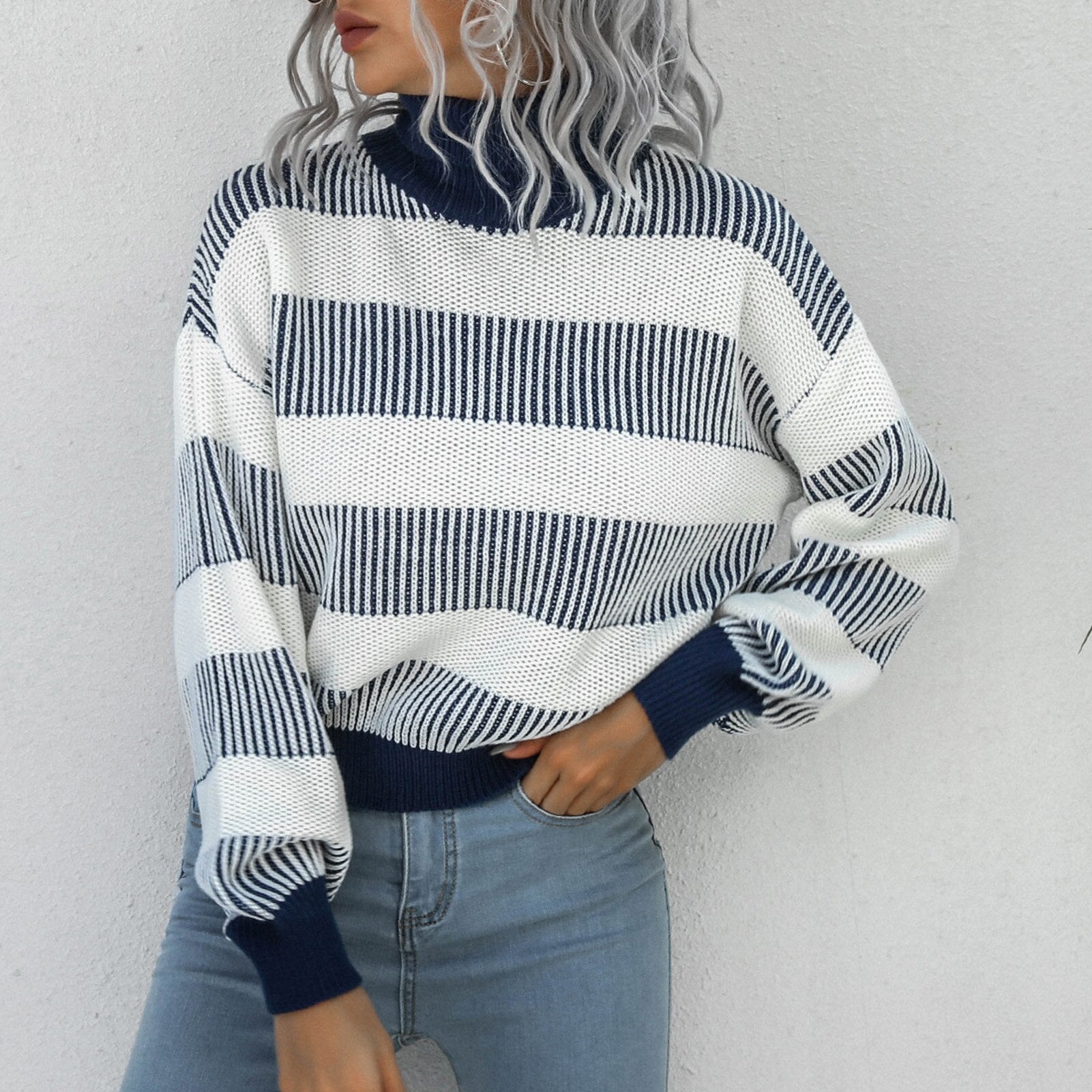 Striped sweater for pairing your favourite jeans. It has loose silhouette, rollover turtleneck, drop shoulder and batwing sleeves. Ribbed design at cuff, hem and neck. Have it for autumn and winter.