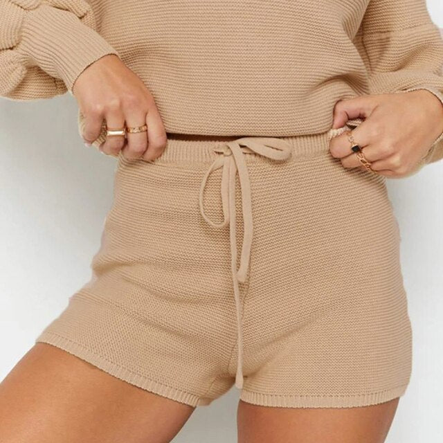 Two Piece Set Matching Sets Womens Outfits Knitted Lantern Sleeve Fall Winter Clothes Women Sweaters Shorts Suit 2021 Fashion