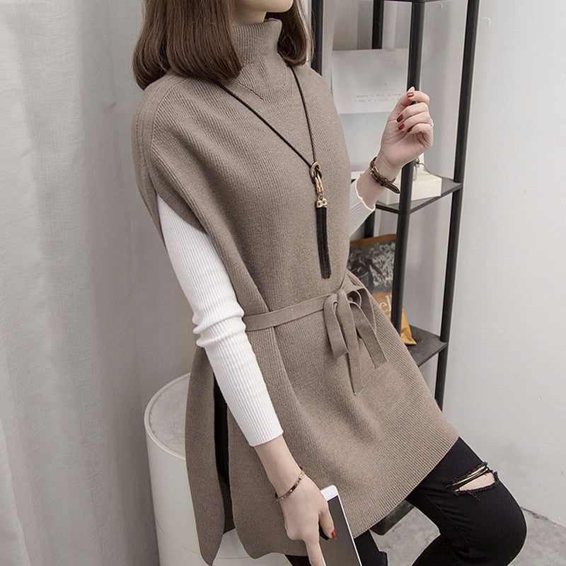 Winter Women Sweater Vest Short Sleeve Women Sweater 2021 Belt Turtleneck Knitted Sweater Women Pullovers Sweaters Tops E474
