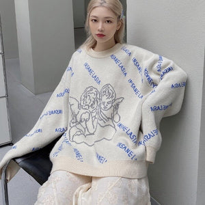 • Angel Pattern Women Sweater Oversized Streetwear Retro Lazy Pullover Trendy Brand O Neck Fashion Harajuku Sweaters 2021 Winter