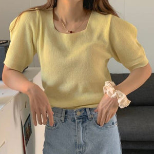 • Summer Elegant Solid Women Square Collar Sueter Mujer Korean Knitted Puff Short Sleeve Female Sweaters Vintage Thin Pullovers