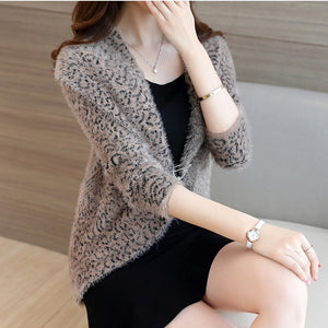 • Women's Fashion Leopard Cashmere Sweaters Long Sleeve V Neck Casual Loose Cardigans knitting Thicken Tops