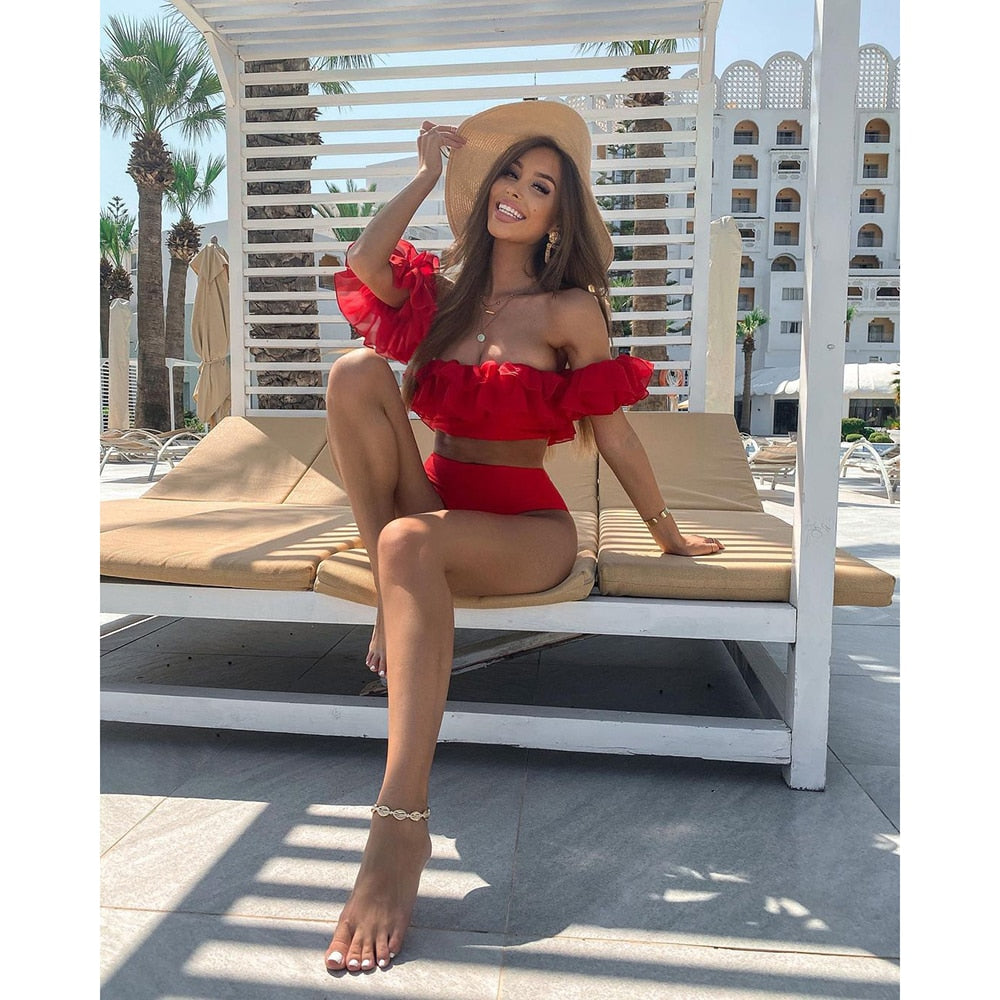 2021 Sexy Double Ruffle Bikinis Women Swimsuit Solid High Waist Swimwear Off The Shoulder Bathing Suit Beachwear Bandeau Biquini