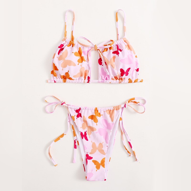 Bikini Swimsuit Women's Swimwear Pink Sexy Butterfly Print High Waist Thin Sling Strapless Beach Suit