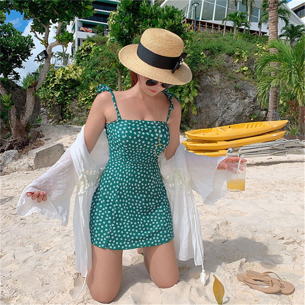 Korea Style One Piece Swimsuit Women Dots Print Swimwear Skirted Monokini Push Up Swim Suit Bow Trikini Green Bathing Suit Pad