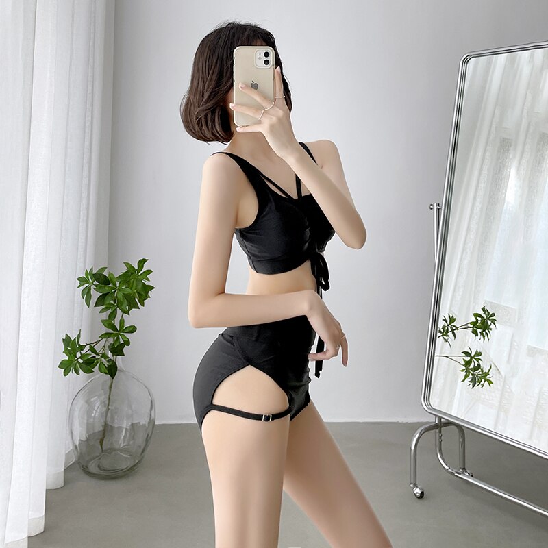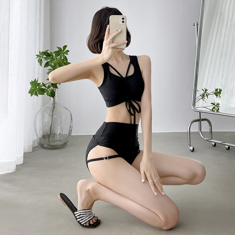 Korean Style High Waist Bikini Set Women Lace Up Biquini Suit Two Pieces Pleated Swimwear Solid Swimsuit Bandage Beach Suit 2022