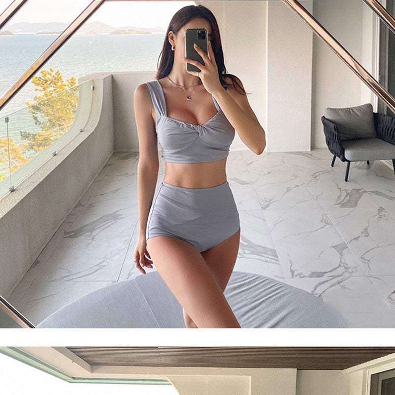 Korean Style Mid Waist Bikini Set Women Biquini Suit Two Pieces Swimwear Solid Swimsuit High Quality Beach Suit 2020 New