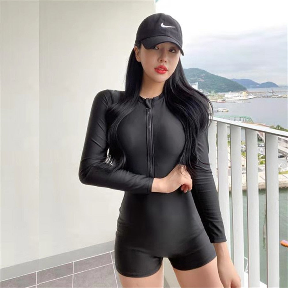 Long Sleeve Rash Guards For Women Solid One Piece Swimsuits Zipper Swimwear High Neck Monokini Shorts Surfing Suits Black Sports