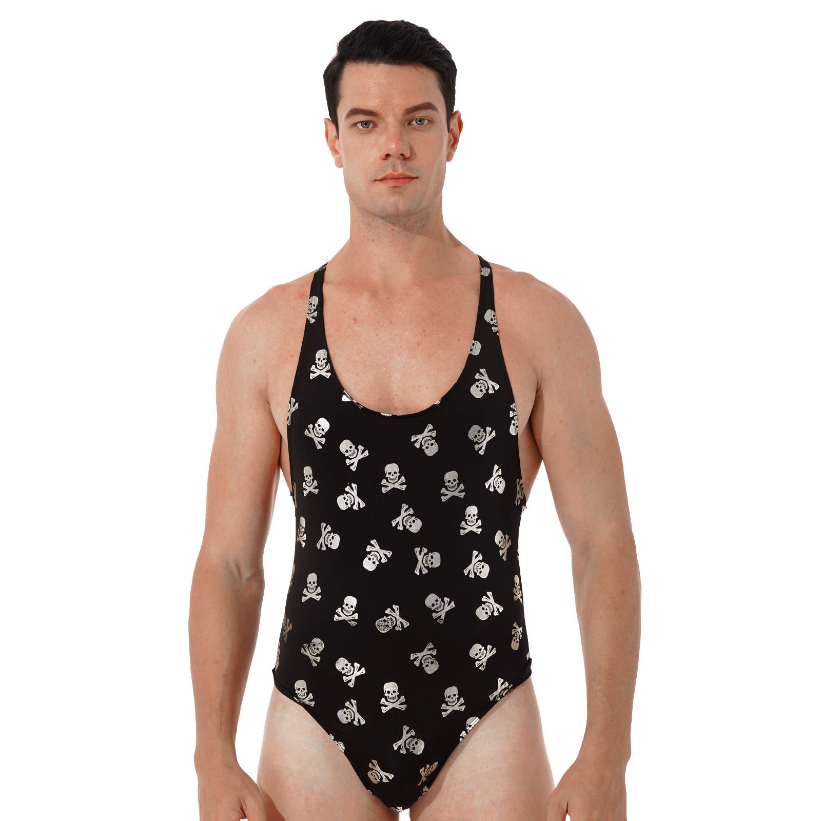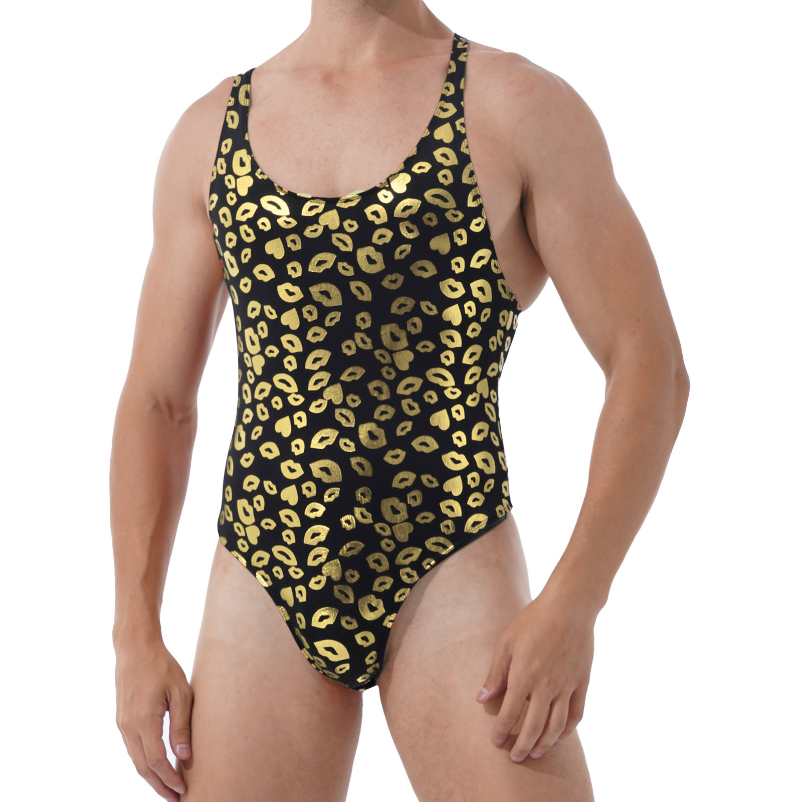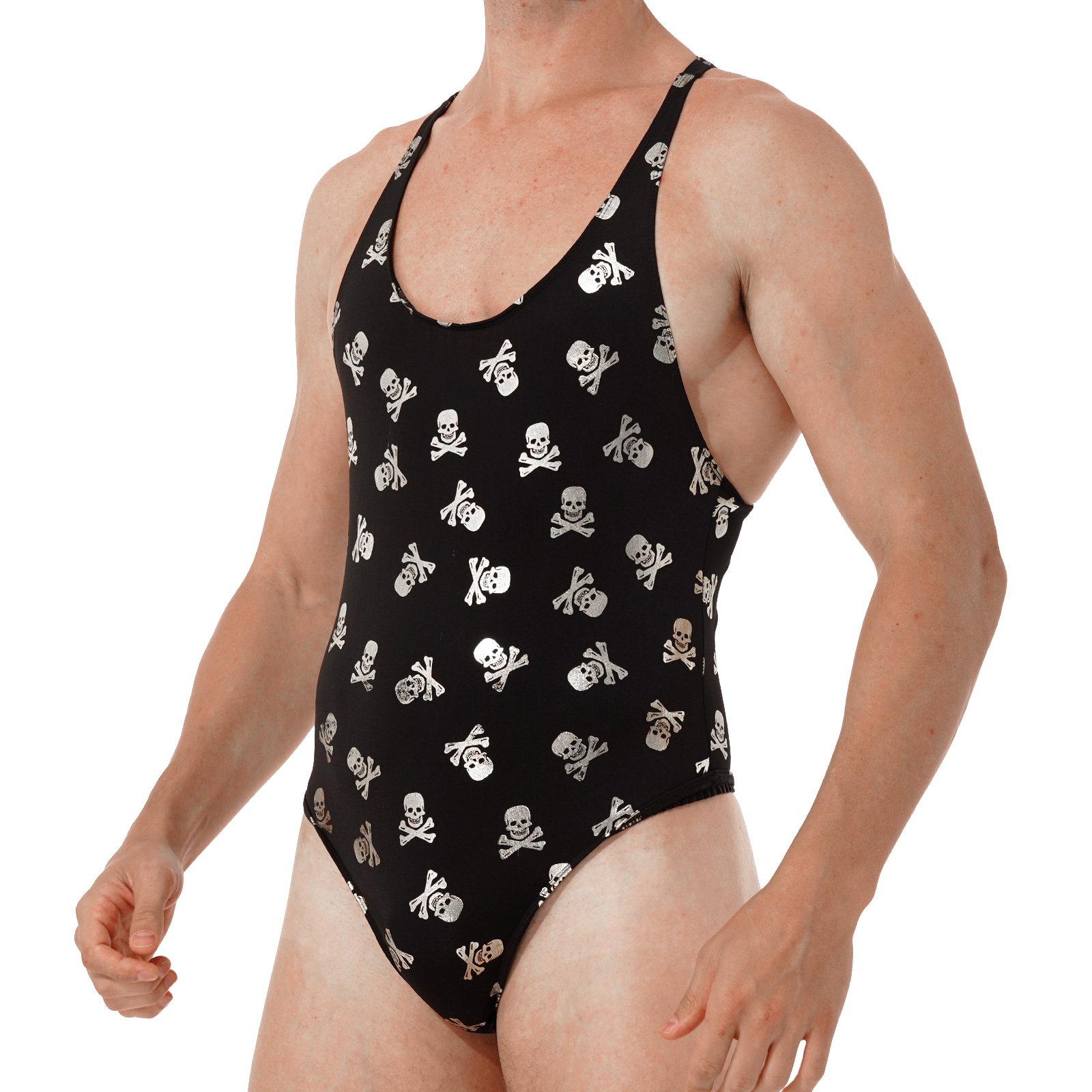 Mens Lip/ Skull Print Bodysuit Fashion Romper Jumpsuit Round Neck Sleeveless High Cut Slim Leatord One-piece Swimsuit Swimwear