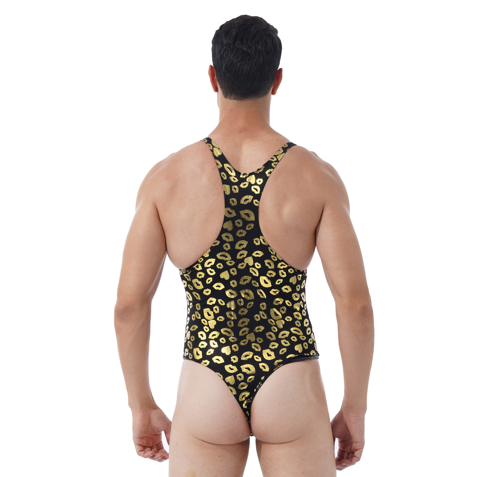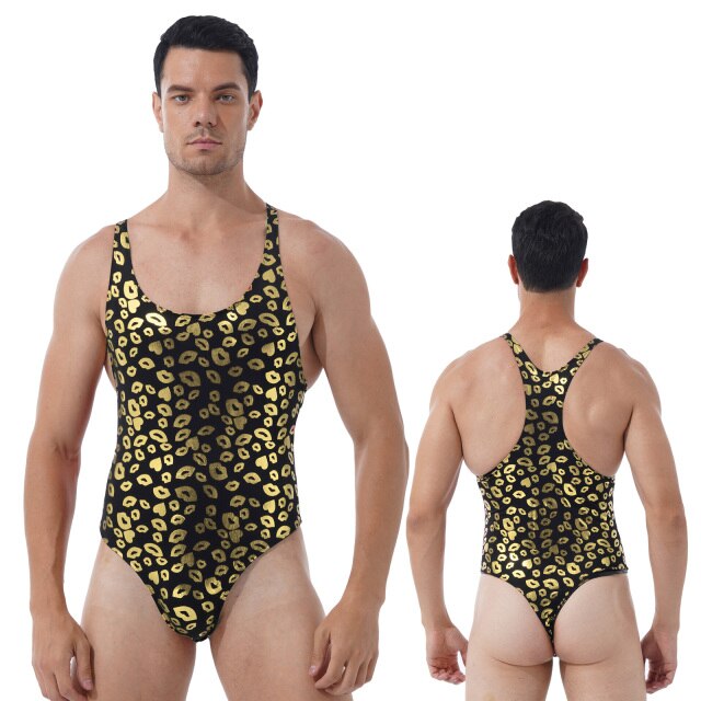 Lip/ Skull Print Bodysuit Fashion Round Neck Sleeveless High Cut Leatord One-piece for Men.