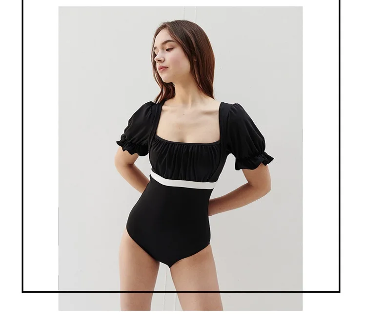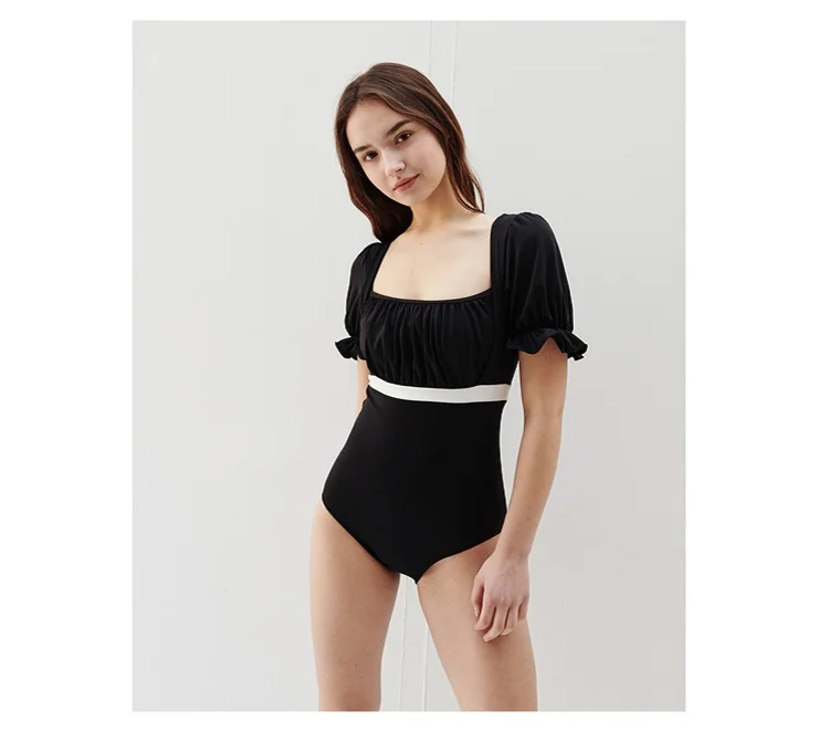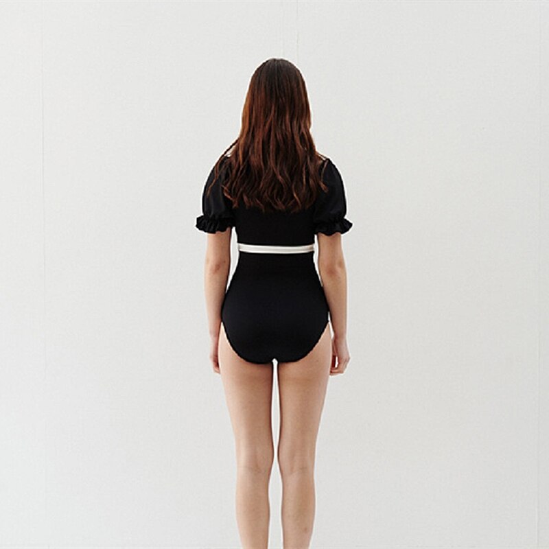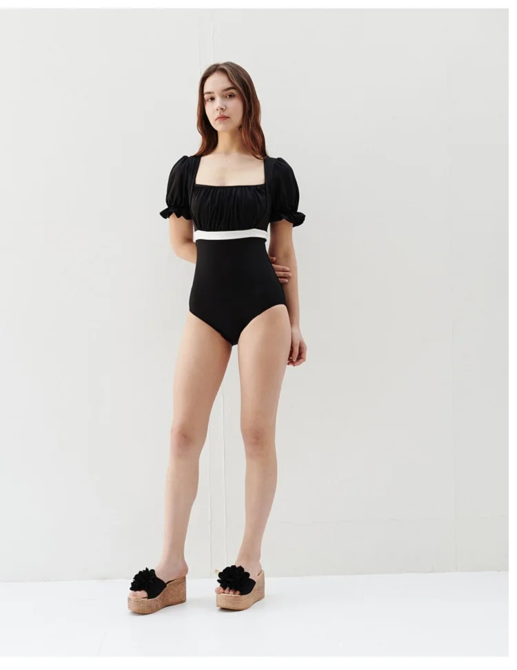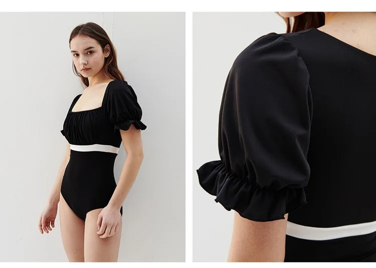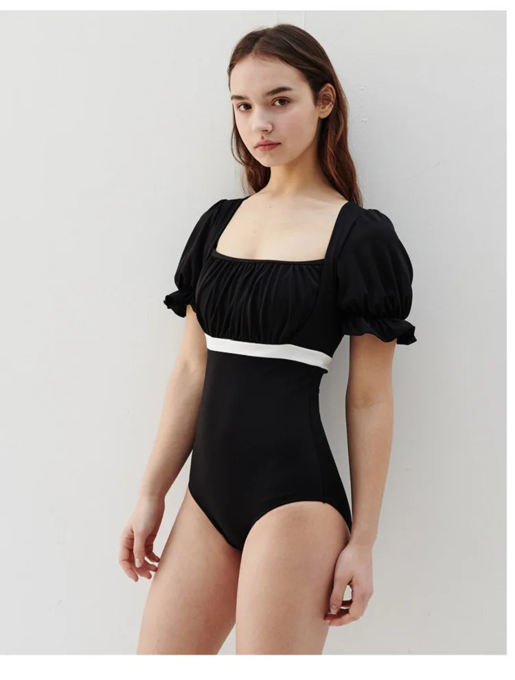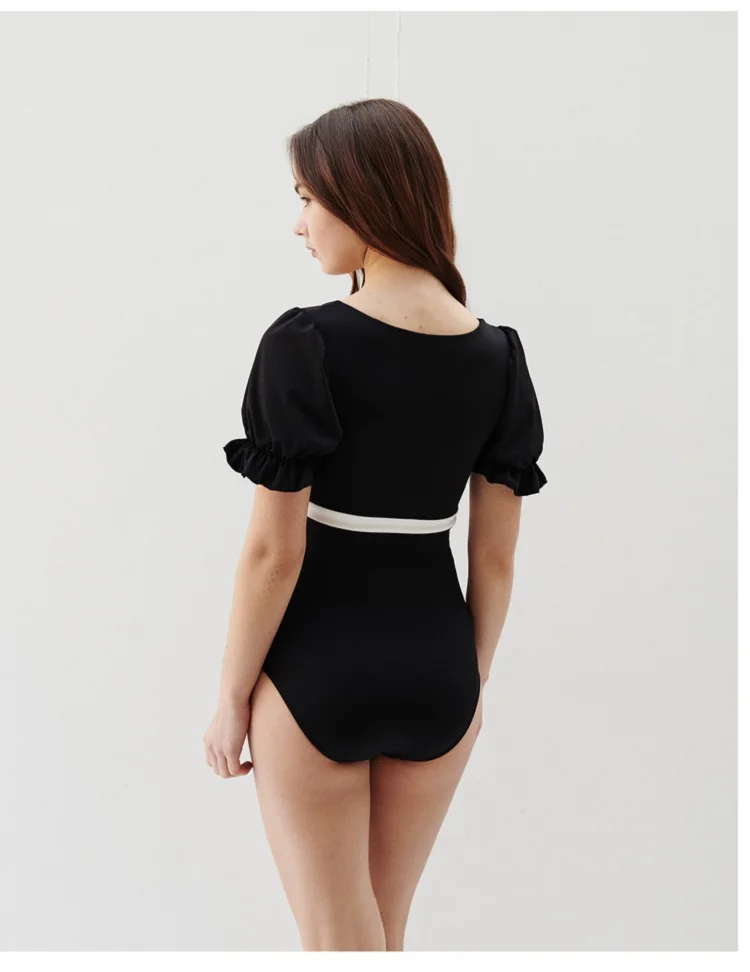 Puff Sleeve One Piece Swimsuit Women Black Swimwear Short Sleeves Monokini Swim Suit Trikini Padded Bathing Suit High Waist