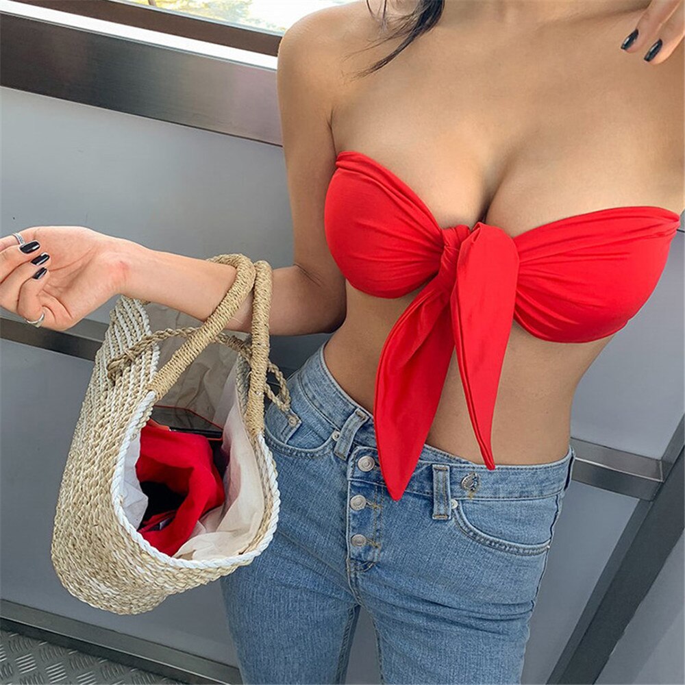 Item type: Bikinis set Gender: Women Support type: Wire free Waist: Low waist With pad: Yes Material: Nylon 82% + Spandex 18% Fit: fits true to size, take your normal size Pattern type: Solid Brand name: Sundfotday Model number: Bikini Style:Sexy bandeau style Feature: Ruffle Size: M L XL Color: Red White Is-customized: Yes Packing: Polybag