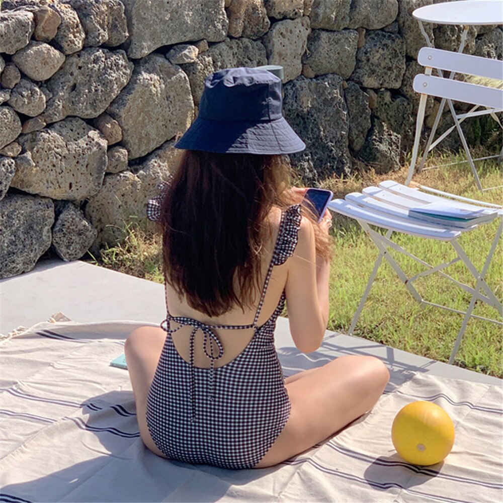 | Sexy Ruffle One Piece Swimsuit Women Plaid Swimwear Open Back Monokini Push Up Pad Bathing Suit Bandage Swim Suit Trikini Green |
