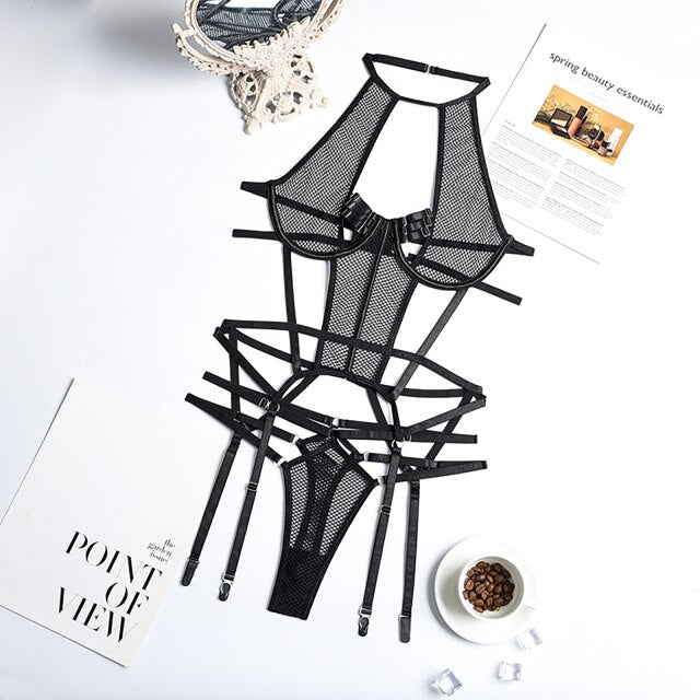 Halter neck, rims for better shape and support, o-ring connected strappy bodysuit lingerie.