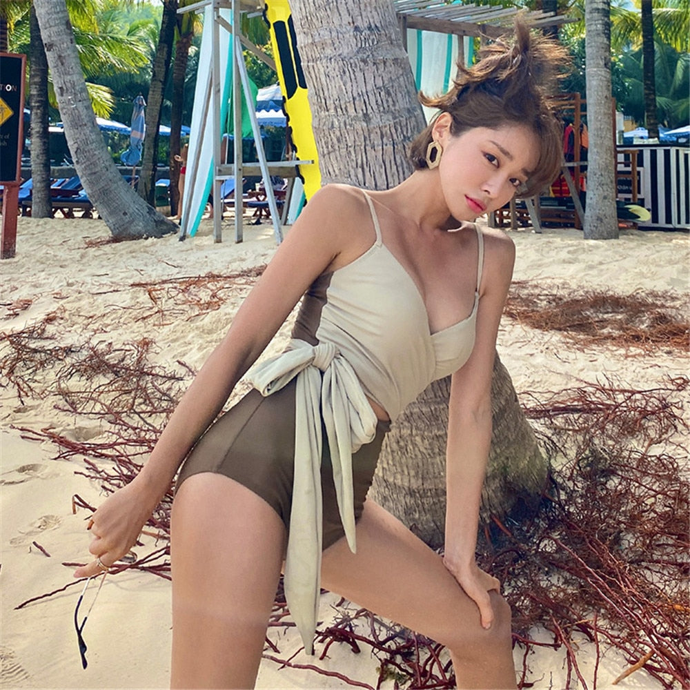 | Sexy Wrap One Piece Swimsuit Women Solid Swimwear Patchwork Monokini Push Up Swim Suit Cut Out Trikini Pad Bathing Suit Beige |