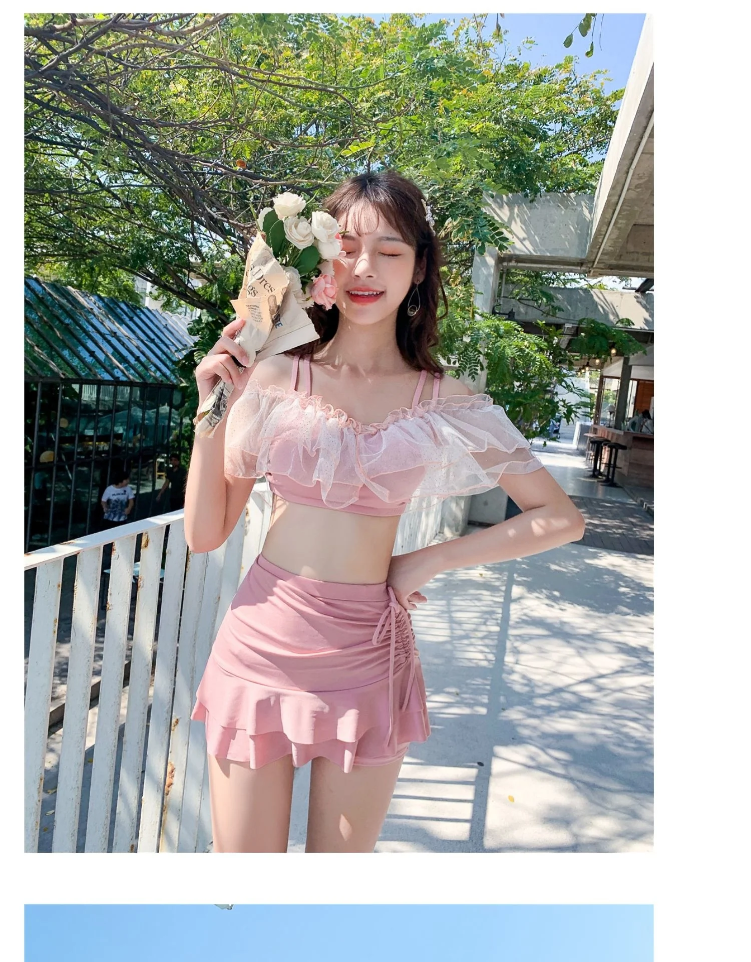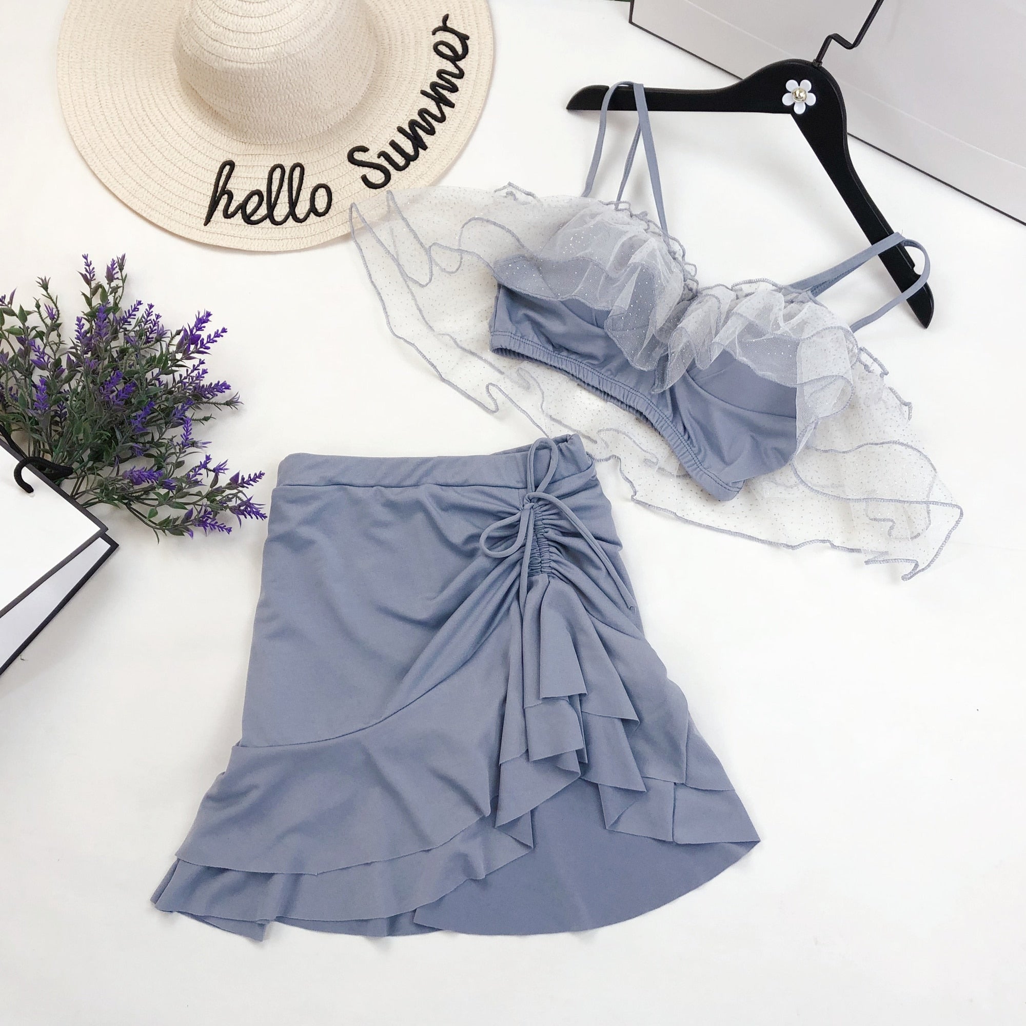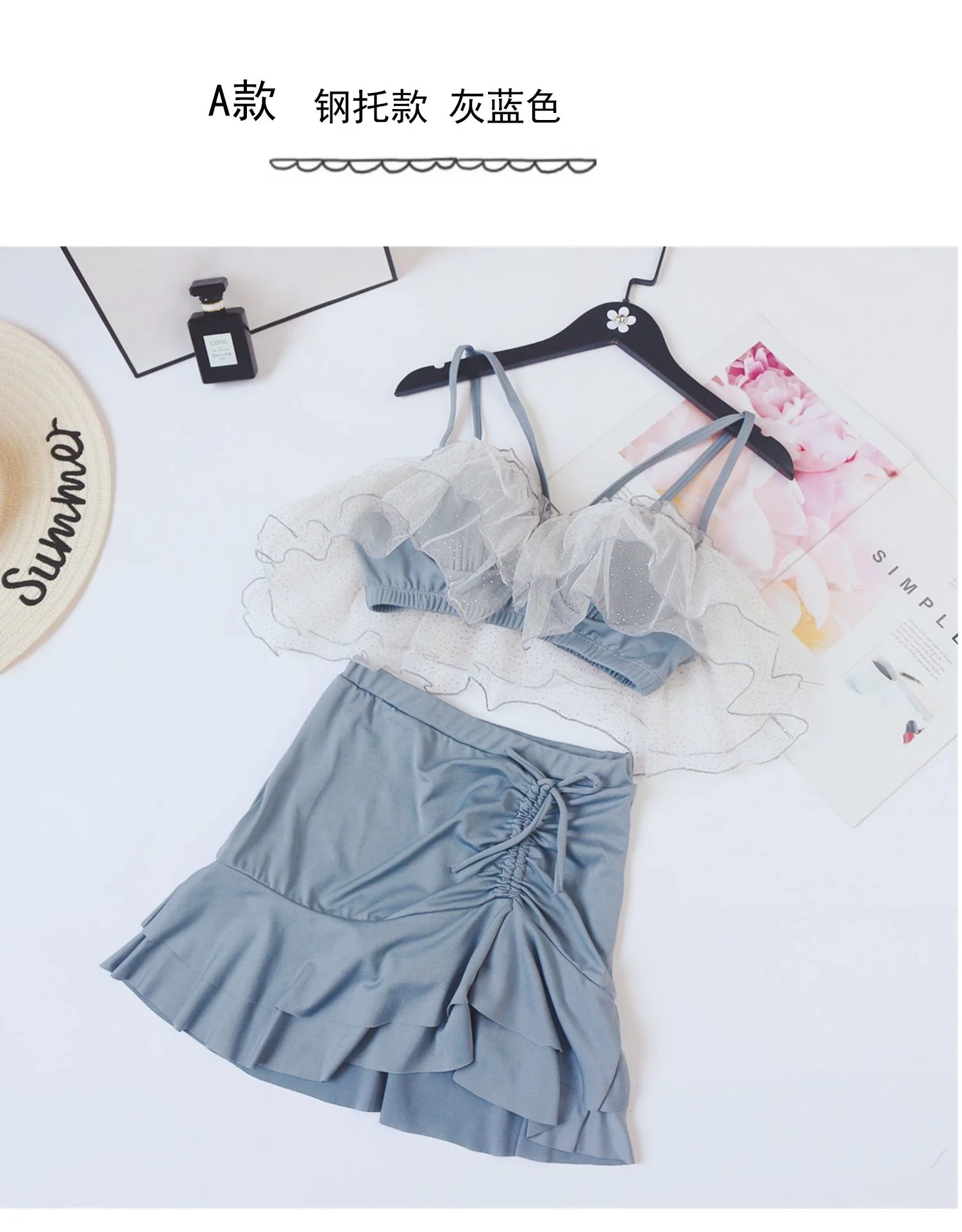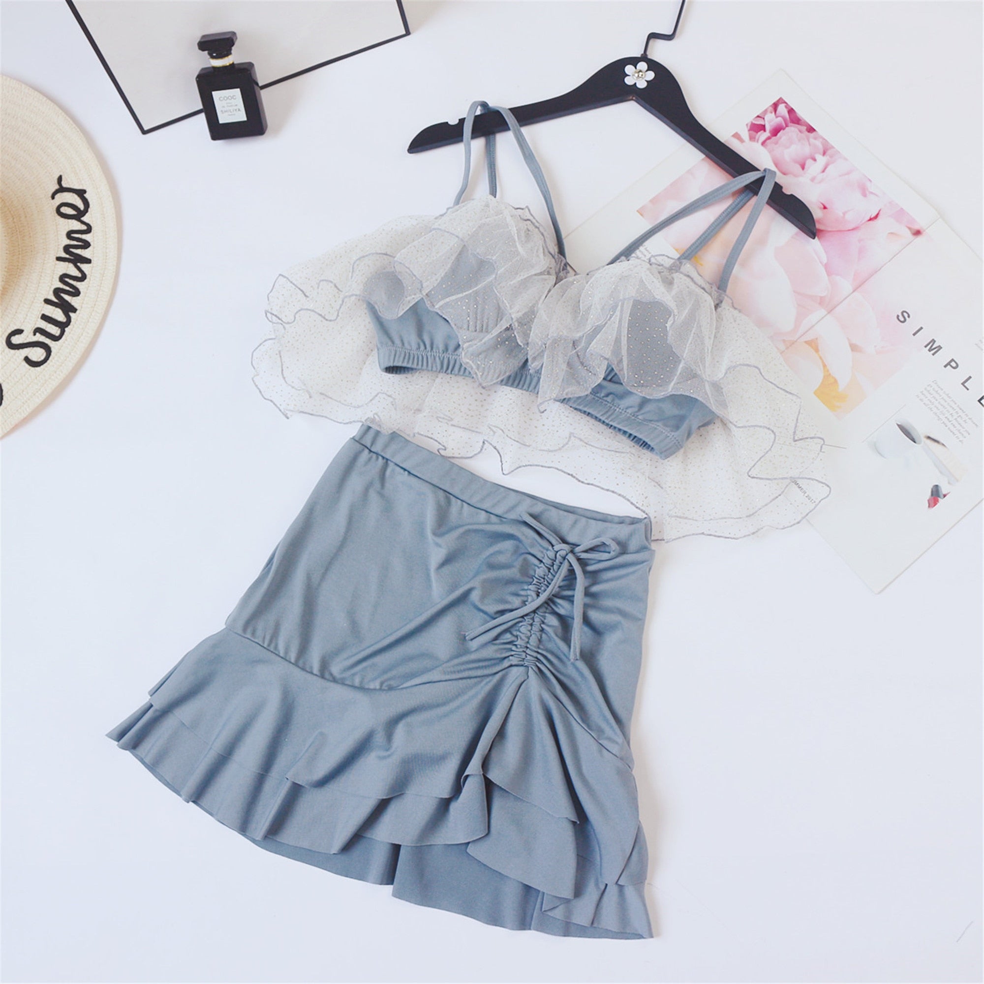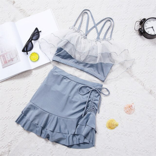 Two-Piece Swimsuit Korean Fairy Sweet Covering Belly Thin High Waist Gather Conservative Hot Bikini Swimwear Bathing Suit Women